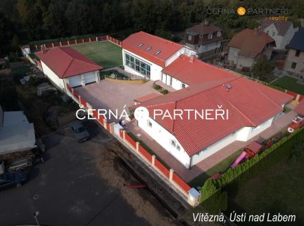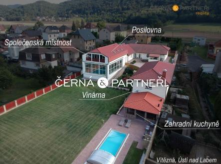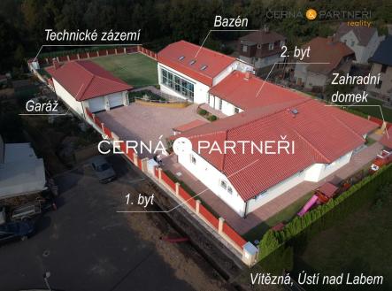 V zastoupení majitele nabízím k prodeji luxusní rodinný dům se dvěma byty ( zastavěná plocha 485 m2), garáží (116 m2), vnitřním a venkovním bazénem, dále je tu , fitness, letní místnost (vinárna), letní kuchyně, technická místnost, zahradní domek na nářadí, dále zahradní dům opatřeným wifi, televizí, topením, ventilátorem a soukromé dětské hřiště. Celý objekt (bez vnitřního bazénu a fitness) je bezbariérový, celková plocha pozemku je 2 680 m2. Podlahové vytápění objektu zajišťují dvě akumulační nádrže na vodu ohřívané elektřinou, v garáži a vinárně jsou krbová kamna. Vodu do kuchyní zajišťuje dodávka z vodovodního řadu, do bazénu vlastní studna. V celém objektu je elektronické zabezpečovací zařízení, televizní rozvod, ve kterém lze sledovat všechny 16 ks kamer, včetně 300 TV programů, datový rozvod (IT), samostatné klimatizační jednotky v každé místnosti, předokenní termoizolační rolety atd.. Pohodlný vjezd umožňují dvě elektrické brány na dálkové ovládání. Dům byl kolaudován v květenu 2007, Svádov, Ústí nad Labem, je klidná lokalita, výjezdem ze spodní brány je možno se napojit ihned na cyklistickou stezku vedoucí podél řeky Labe. Měsíční náklady na provoz domu pro 4 osoby včetně pojištění celkem 25.000,- Kč Pro zájemce je k dispozici virtuální prohlídka s kompletním půdorysem a rozložením místností. V obci je městská hromadná doprava včetně pravidelné autobusového, vlakového spojení. Do centra Krajského města Ústí n/L cca 5 min., nájezd na dálnici D8 cca 10 min. Pro bližší informace kontaktujte makléře zakázky.