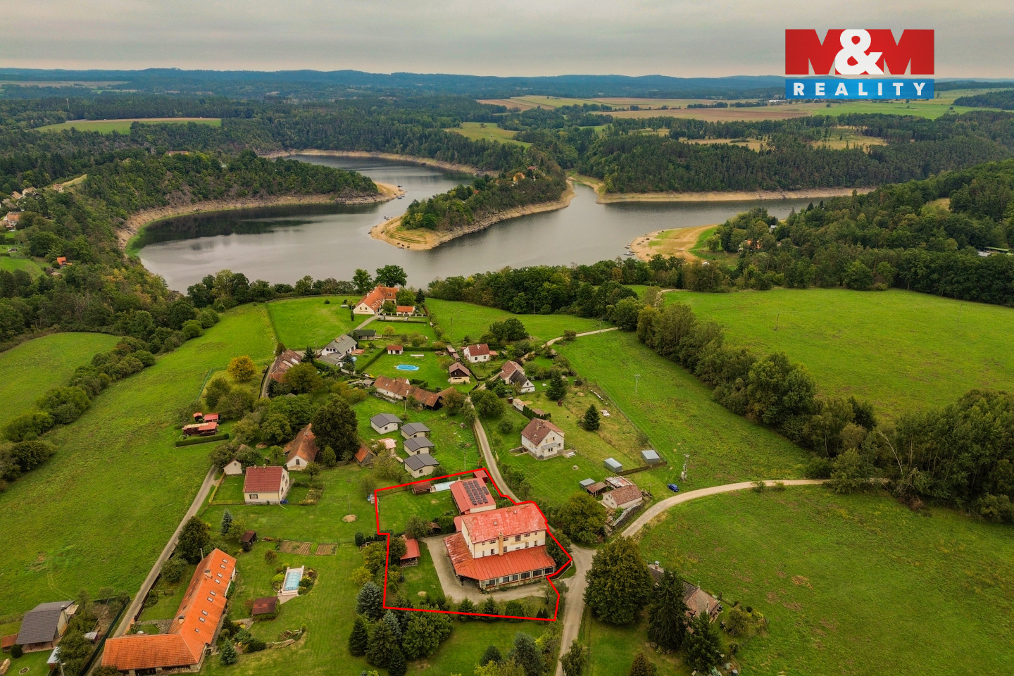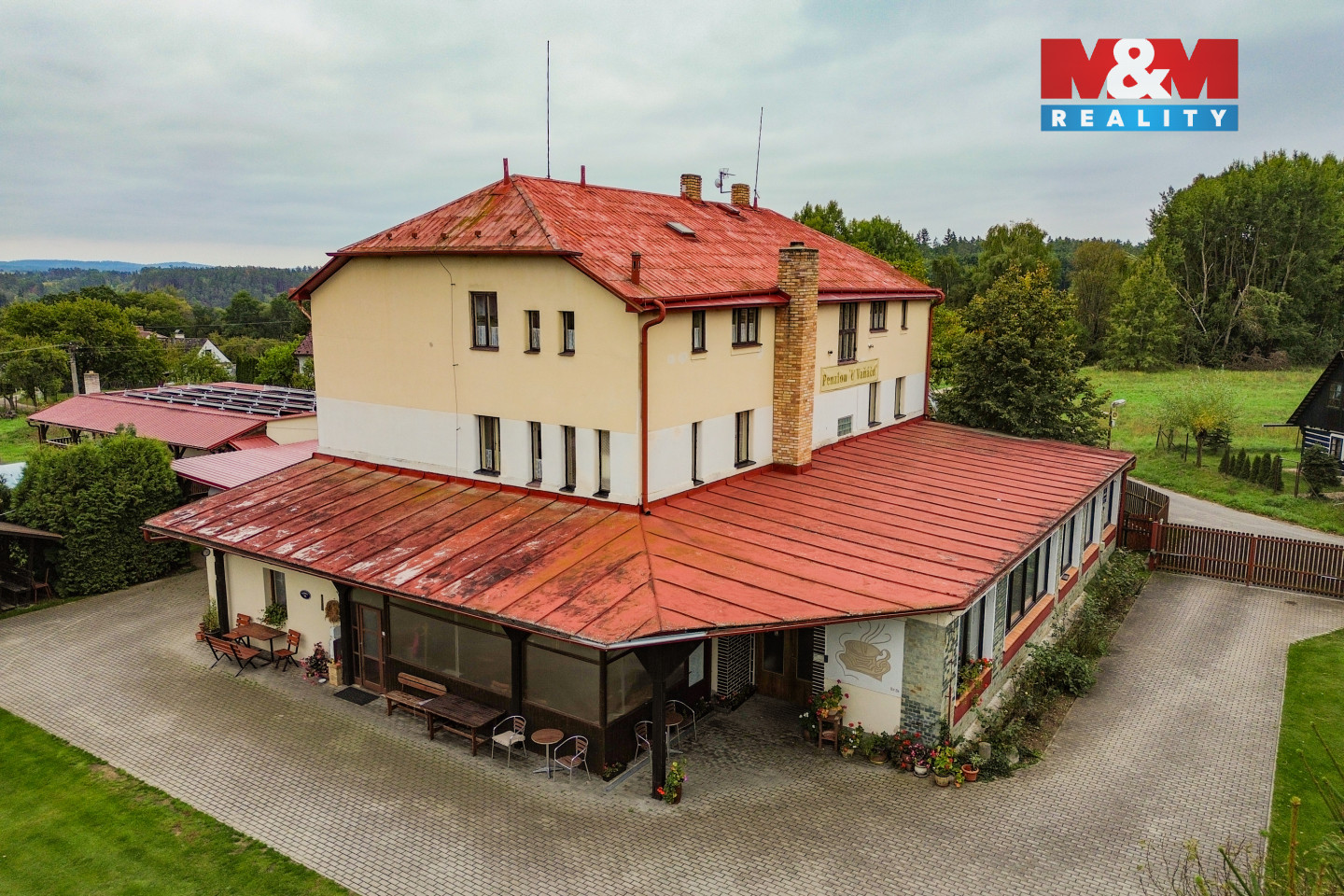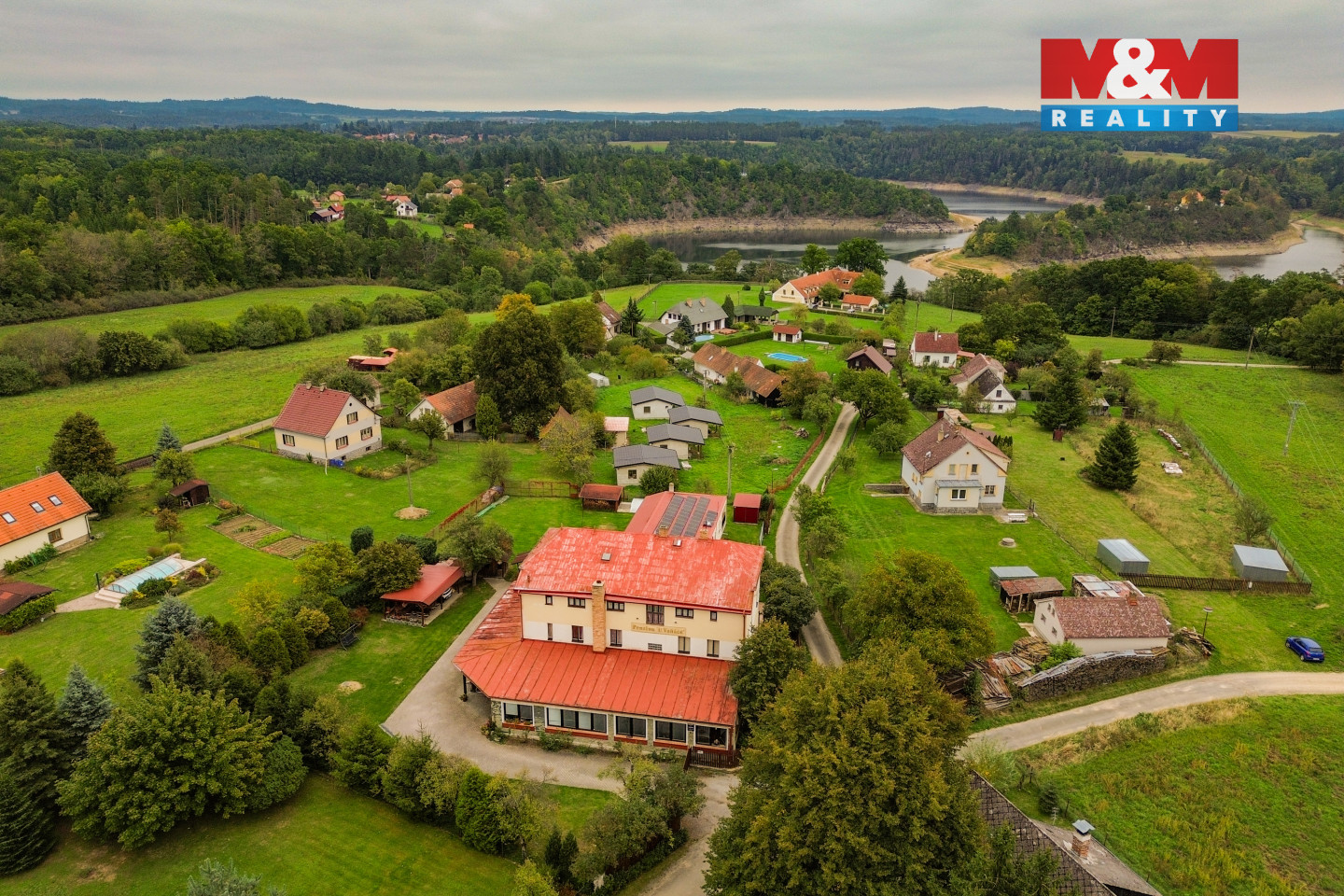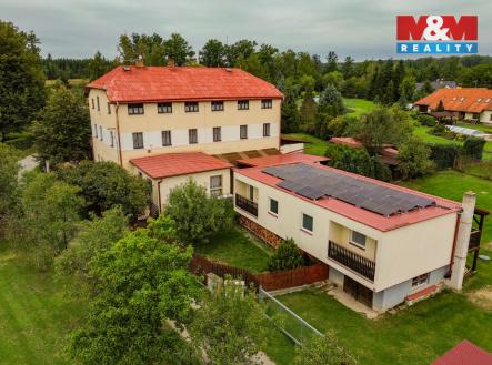 Nabízíme k prodeji jedinečný rodinný penzion(1058m2), který se nachází u Orlické přehrady v krásné jihočeské krajině uprostřed lesů, 600 m od řeky Otavy a 4 km od hradu Zvíkov, ve vesničce Štědronín. Zavedený penzion nabízí ideální příležitost pro investory a podnikatele. Skládá se ze dvou budov. V hlavní budově je restaurace s barem, výčep, kuchyně, sklad, kotelna a byt 3+kk, který je vytápěn samostatně tep. čerpadlem. V prvním patře najdete 5 apartmánů s vlastním sociálním zařízením. Ve druhém patře je 8 pokojů s WC a sprchami na chodbě.Ohřev vody řešen bojlerem. Vytápění centrální od dvou samost. kotlů na dřevo a pelety + elektrokotel. V samostatné budově jsou 2 apartmánové rezidence s vybavenou kuchyňkou, televizí, WC, sprchovým koutem, balkonem a terasou. Zdroj vody je samostatná studna a vrt. Celý objekt má ČOV. Velkou předností je nyní nově nainstalovaná FVE pro celý objekt. Na pozemku se dále nachází bazén,chatky,garáž Neváhejte a kontaktujte nás pro více informací či prohlídku