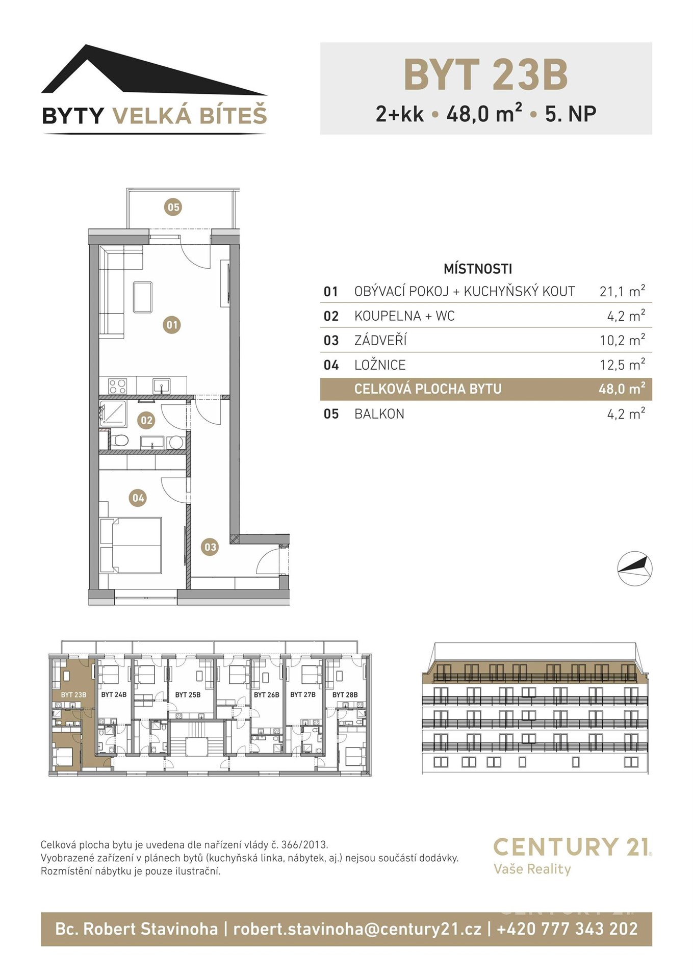 Projekt Byty Velká Bíteš pokračuje další etapou výstavby bytového domu s označením BD04 a nabídne celkem 28 bytových jednotek o dispozicích 1kk a 2kk. Je zde kladen důraz na komfortní bydlení s nízkými provozními náklady, kvalitními materiály a nadčasovým designem. Většina bytů bude disponovat balkónem s pěkným výhledem na přilehlou zeleň a centrum města. Ke každému bytu lze přikoupit sklepní kóje. Pro ty, kteří by chtěli kryté parkovací stání, budeme mít připraveno 7 garážových parkovacích stání v 1. podzemním podlaží. Samozřejmostí je dostatek parkovacích míst v okolí bytového domu. Součástí domu bude moderní výtah pro zajištění komfortní přepravy ať už z přízemí či garážových prostor přímo na patro k jednotlivým bytům, čímž je zajištěn bezbariérový přistup. Předpokládaný termín dokončení je podzim 2027. Uvedený byt: 23B, 5. NP, s podlahovou plochou vč. balkonu 52,2 m2, užitná plocha bytu 48,0 m2 + 4,2 m2 balkón. K bytu je možnost dokoupit: garážové parkovací stání podzemní = 425 600 Kč vč. DPH sklepní kóje = 56 000 Kč vč. DPH Ve standardním provedení každého bytu jsou laminátové podlahy EGGER, obklady a dlažby ABITARE ICON v koupelně a na toaletě vč. sanity (sprchový kout s odtokovým žlábkem, WC, umyvadlo, baterie, zrcadlo s LED podsvícením), interiérové dveře, bezpečnostní vstupní dveře a okna s trojskly. Vytápění zajištěno pomocí elektrického podlahového topení, dále příprava na klimatizaci na JV straně, zvýhodněné nabídky dodání a montáže kuchyňské linky přímo od investora. Bytový dům bude plnit PENB–B. Velká Bíteš je město s rodinnou atmosférou, výbornou polohou a širokými možnostmi pro život i práci. Díky strategické dostupnosti u dálnice D1 se do Brna i Jihlavy dostanete během pouhých 30 minut, což z města činí ideální místo pro všechny, kdo hledají klidné bydlení blízko větších center. Město je zároveň významným průmyslovým centrem. Sídlí zde například společnost PBS, výrobce leteckých motorů, a lokalita bude v budoucnu profitovat i díky plánované výstavbě nových jaderných bloků v Dukovanech. To zvyšuje nejen poptávku po kvalitním bydlení, ale také investiční potenciál nemovitostí. Vznikající bytové jednotky, které jsou ideální pro vlastní bydlení i jako výhodná investice, jsou navrženy s důrazem na nízké provozní náklady, kvalitní materiály a nadčasový design, aby zajišťovaly komfortní a dlouhodobě hodnotné bydlení. Občanská vybavenost je v místě kompletní – školy, školky, obchody, zdravotní péče a další služby jsou snadno dostupné. V bezprostřední blízkosti se navíc připravuje nový městský park, který doplní okolní přírodu a nabídne prostor pro sport, relaxaci a volnočasové aktivity. Sportovní vyžití nabízí hokejový stadión HC Spartak Velká Bíteš a fotbalový klub FC PBS Velká Bíteš. Projekt Byty Velká Bíteš je kombinací komfortu, moderní architektury a strategické polohy. Ať už hledáte vlastní domov, nebo investici s perspektivou růstu hodnoty, tyto byty představují ideální volbu pro současné i budoucí generace.