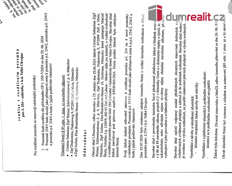 Vážení zájemci o nemovitost, 255/4 každý o výměře 700 m² v krásném prostředí obce Velkého Chvojna. Stavební povolení pro rozdělení pozemků na čtyři parcely mame schválené jak stavebním úřadem tak i krajským rozvojovým úřadem tudíž nebrání nic k výstavbě rodinných domu a je již zapsáno v katastru nemovitostí. Ten to pozemek je ideální pro výstavbu rodinného domů, který můžou mít dvě nadzemní podlaží a podkroví. Na hranici pozemku jsou k dispozici veškeré vedení vody, elektrické energie na hraně pozemku a kanalizace lze připojit do 30 metrů, což zajišťuje pohodlnou a komfortní stavbu. Pozemek je určen k bydlení a musí zachovávat poměr zastavitelné plochy k nezastavěné ploše maximálně 0,3, přičemž maximální zastavěná plocha nesmí přesáhnout 210 m². Nemovitost je situována ve velmi atraktivní lokalitě, u silnice a v centru Velkého Chvojna. Nezmeškejte tuto skvělou příležitost k získání svého vysněného domova v klidném a bezpečném prostředí. Pro bližší informace nás neváhejte kontaktovat. Reality Škutovi Vaši spolehliví partneři na realitním trhu. Ev. číslo: 646921.