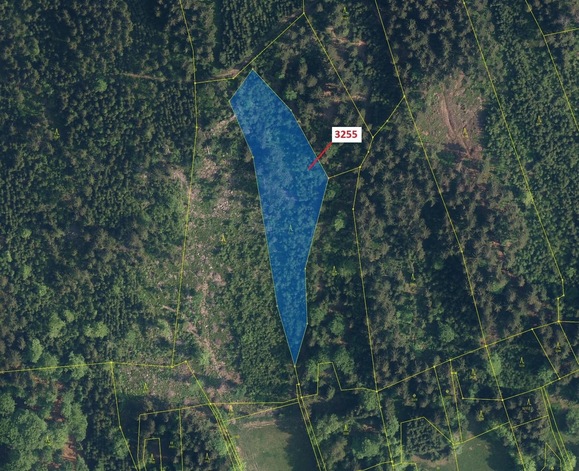 Lesní pozemek o výměře 6125 m2, parcelní číslo 3255, podíl 1/1, katastrální území Velké Hamry, obec Velké Hamry, obec s rozšířenou působností Tanvald, okres Jablonec nad Nisou, Liberecký kraj. Po těžbě.