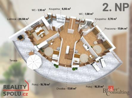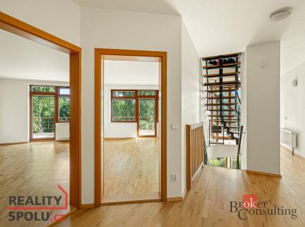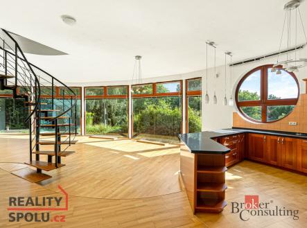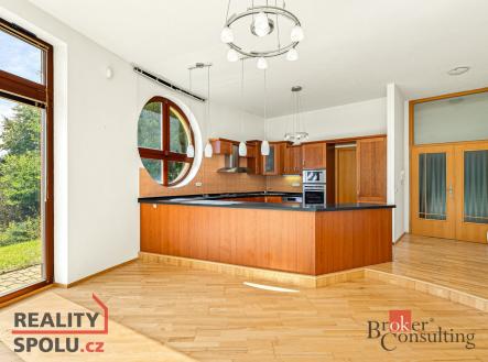 Na klidném místě na okraji obce Velké Popovice se nachází unikátní rodinný dům z roku 2002. Rozlehlý pozemek 3789m2 v žádané rezidenční části, která zabezpečuje absolutní soukromí skrývá prostorný rodinný dům. Ing.arch Ladislav Komrska jej navrhl pro potřeby rodiny s více dětmi a nekonečnou možností pohybu. V přízemí najdete garáž pro dva osobní vozy ze které vstoupíte buď do technické místnosti, nebo přes halu s nákupem přímo do komory, kterou pokračujete až do kuchyně. Obytný prostor s krbem, který se tu z kuchyňského koutu otevírá má úctyhodných 73m2 a francouzská okna po celé jihozápadní straně jej bohatě osvětlují a zvou do zelení překypující zahrady. V přízemí je pak dále pracovna a pokoj pro hosty či ložnice, koupelna se samostatnou toaletou, technická místnost a ve vstupní hale i samostatná toaleta s umyvadlem pro návštěvy a pro snadný přístup ze zahrady. V prvním patře, kam vystoupáte po vzdušném schodišti jsou k dispozici 4 ložnice , dvě koupelny a dvě toalety. Vestavné skříně v chodbě pak nabízí dostatek místa pro uložení potřebných věcí. Ze všech čtyř ložnic pak můžete vstouupit na 80m2 velkou terasu, která před Vámi otevře výhled do zeleně a na celé malebné městečko pod vámi. Prostorný dům s velkým potenciálem je nyní připraven na nové obyvatele, kteří jej mohou přizbůsobit vlastním potřebám. Zahradu lze využít pro další stavby k bydlení či odpočinku, nebo jen ponechat volně bujet zeleň, která zde vzácně doplňuje zajímavou stavbu domu. Představit si zde lze i sídlo firmy, kancelář či pozemek rozdělit a realizovat zde další stavbu k bydlení. Přijďte se podívat a odhalit potenciál tohoto místa, jsme vstřícní k jednání o budoucí ceně.