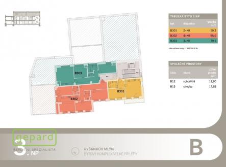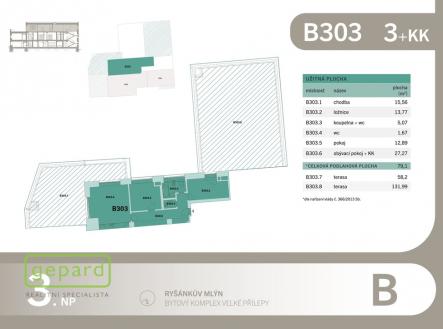 Realitní společnost Gepard nabízí k prodeji byt v OV 3+kk, 79,1m2, dvě terasy 132 a 58m2 (byt č. B303) v developerském projektu Ryšánkův mlýn ve Velkých Přílepech vzdálených od Prahy pouhých 6km a 15min autem. Byty v budově B jsou dokončené ve vysokých standardech jako např.: plasto-hliníková okna v budově B, podlahy 1.NP vinylové, 2. a 3.NP třívrstvé dřevěné podlahy v barvě dubu, byty jsou vybaveny kvalitní kuchyňskou linkou se spotřebiči Elektrolux a osvětlením, obojí v ceně. Vytápění je zajištěno společnou plynovou kotelnou v budově. K dispozici je venkovní parkovací stání za 224.000Kč. Kolaudace proběhla v dubnu 2025. Projekt Ryšánkův mlýn zahrnuje dvě zrekonstruované budovy propojené společným vchodem. Původní stavba z 19. století disponuje devíti byty s maximálně možným zachováním dobových prvků od 1kk po 3kk. Druhá budova v industriálním stylu nabízí 16 bytů. Jsou zde i byty se zahrádkou, terasou nebo balkonem. Všechny byty mají sklepní kóji a k dispozici jedno parkovací stání. Velké Přílepy disponují plnou občanskou vybaveností, spojení MHD na metro Bořislavka a Dejvická. Podlahová plocha je uvedená dle nařízení vlády č. 366/2013Sb, tzn. včetně příček. Pro klienty tohoto projektu zajistíme výhodné podmínky financování a případný prodej Vaší stávající nemovitosti. Sjednejte si prohlídku a využijte možnosti výběru bytu ve zcela novém projektu.