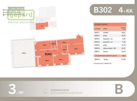 Realitní společnost Gepard nabízí k prodeji byt v OV 4+kk, 95m2 s terasou 58m2 (byt č. B302) v developerském projektu Ryšánkův mlýn ve Velkých Přílepech vzdálených od Prahy pouhých 6km a 15min autem. Byty v budově B jsou dokončené ve vysokých standardech jako např.: plasto-hliníková okna v budově B, podlahy 1.NP vinylové, 2. a 3.NP třívrstvé dřevěné podlahy v barvě dubu, byty jsou vybaveny kvalitní kuchyňskou linkou se spotřebiči Elektrolux a osvětlením, obojí v ceně. Vytápění je zajištěno společnou plynovou kotelnou v budově. K dispozici je venkovní parkovací stání za 224.000Kč. Budova je zkolaudovaná. Projekt Ryšánkův mlýn zahrnuje dvě zrekonstruované budovy propojené společným vchodem. Původní stavba z 19. století disponuje devíti byty s maximálně možným zachováním dobových prvků od 1kk po 3kk. Druhá budova v industriálním stylu nabízí 16 bytů. Jsou zde i byty se zahrádkou, terasou nebo balkonem. Všechny byty mají sklepní kóji. Velké Přílepy disponují plnou občanskou vybaveností, spojení MHD na metro Bořislavka a Dejvická. Podlahová plocha je uvedená dle nařízení vlády č. 366/2013Sb, tzn. včetně příček. Pro klienty tohoto projektu zajistíme výhodné podmínky financování a případný prodej Vaší stávající nemovitosti. Sjednejte si prohlídku a využijte možnosti výběru bytu ve zcela novém projektu.