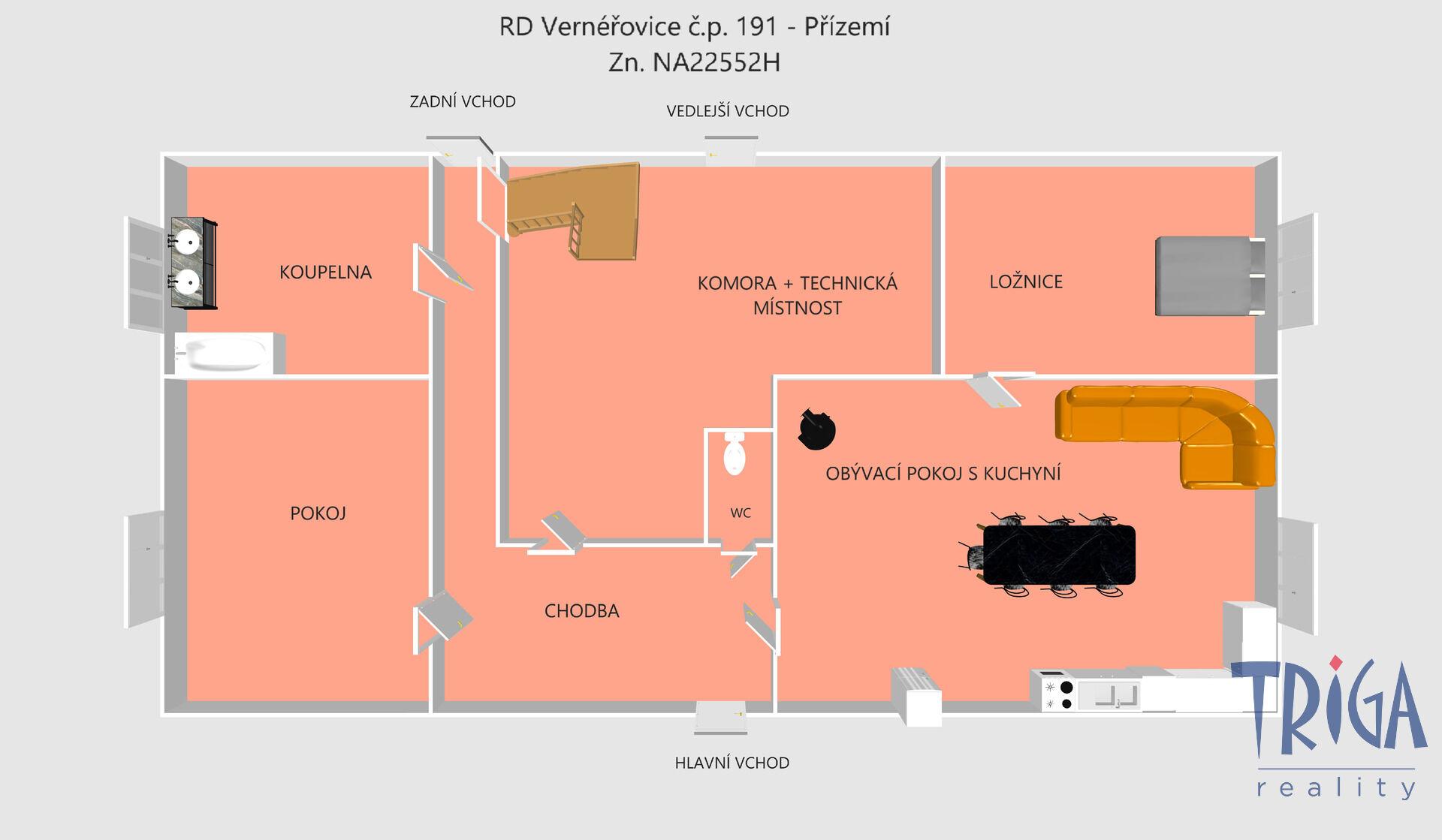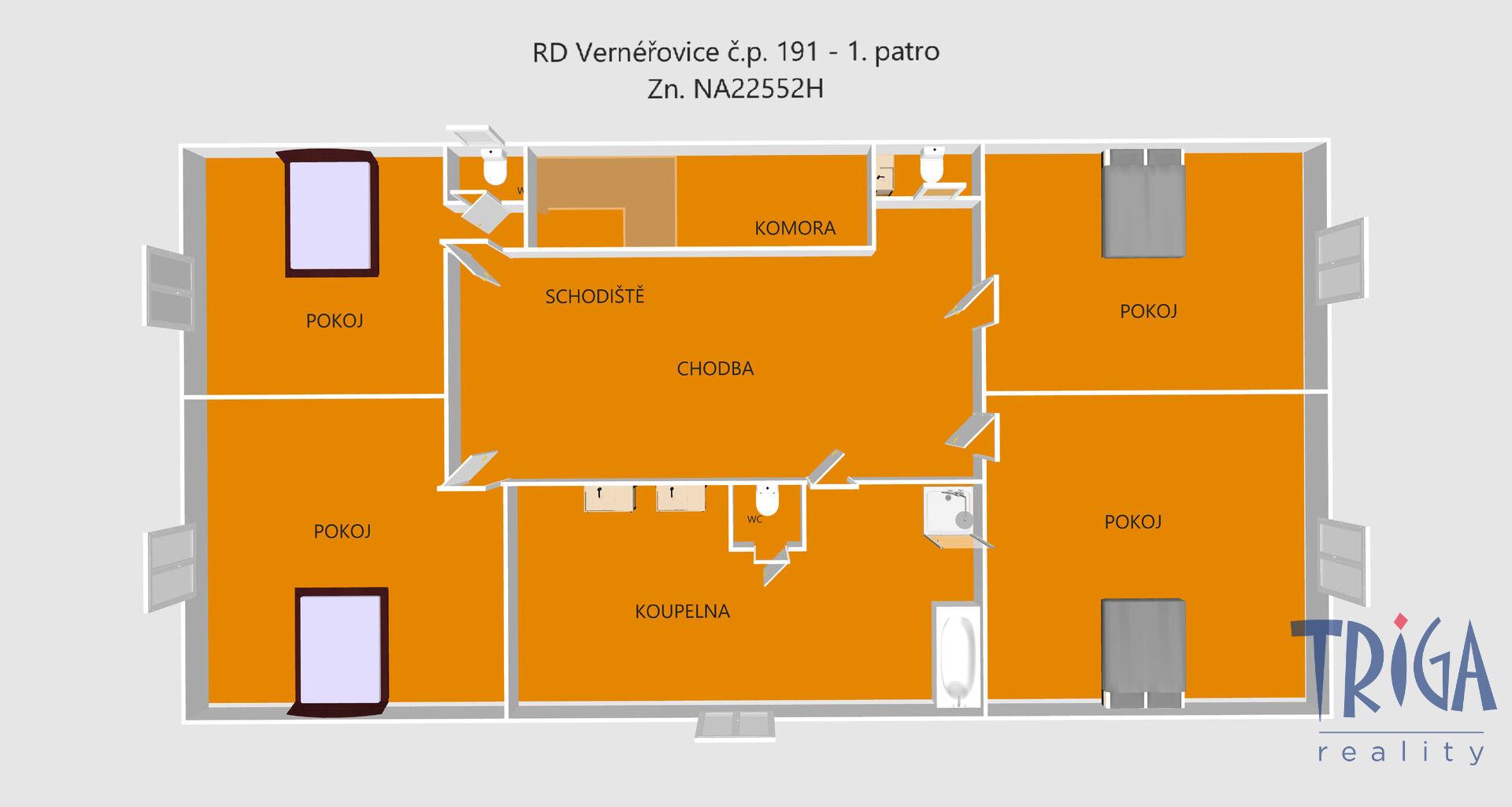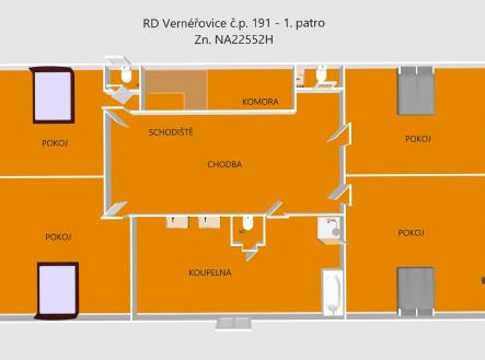 Nabízíme k prodeji výjimečný rodinný dům o dispozici 7+kk v malebné obci Vernéřovice, situovaný na okraji vesnice. Díky této poloze poskytuje naprostý klid, soukromí a krásné prostředí vhodné jak pro trvalé bydlení, tak pro rekreaci. Nemovitost byla původně využívána jako penzion, a nabízí tak i možnost obnovení podnikatelského záměru. Dům je dvoupodlažní a svou dispozicí nabízí dostatek prostoru i pro větší rodinu. V přízemí se nachází prostorný obývací pokoj s kuchyní, jehož dominantou jsou krbová kamna s výměníkem, která vytvářejí příjemnou atmosféru a zároveň zajišťují efektivní vytápění. Dále zde najdeme dva samostatné pokoje, vstup do sklepa propojeného s technickou místností, WC a velkou koupelnu s vanou. Vstupní chodba je průchozí směrem do zahrady za domem. V patře jsou čtyři pokoje, z nichž jeden má vlastní WC. K dispozici je také komora, koupelna s vanou, sprchovým koutem a toaletou a další samostatné WC na chodbě. Technicky je dům velmi dobře řešen: - napojení na obecní vodovod + vlastní studna - vytápění krbovými kamny s výměníkem (14 + 3 kW) v kombinaci s elektrokotlem (21 kW) - podlahové vytápění v přízemí - ohřev vody zajišťuje bojler - odpady svedeny do septiku - v přízemí jsou špaletová okna, v patře nová okna s trojskly Součástí nemovitosti je také prostorná stodola s garáží o zastavěné ploše cca 100 m², která nabízí široké možnosti využití – parkování, dílna, sklad nebo další rozvoj. Příjezd je zajištěn po obecní komunikaci. Vernéřovice se nachází v klidné části Broumovska, v oblasti s minimální zástavbou a nádhernou přírodou. Okolní krajina je ideální pro milovníky turistiky, cyklistiky, běžek i klidné rekreace. V bezprostředním okolí najdete rozsáhlé lesy, louky a množství značených tras. Velkým benefitem je blízkost chráněné krajinné oblasti Broumovsko, vyhledávané pro své skalní útvary, vyhlídky a historické památky. Snadno dostupné jsou také Adršpašsko-teplické skály, Stolové hory či barokní památky Broumovska. Díky poloze u polských hranic je v dosahu i lázeňské město Kudowa-Zdrój s aquaparkem, lázněmi a kavárnami, které rozšiřují možnosti volnočasového vyžití. Lokalita je tak ideální jak pro trvalé bydlení, tak pro rekreační využití či podnikání v oblasti ubytování. Zavolejte si o prohlídku, rádi Vás provedeme. Zak.č. NA22552H PENB: D