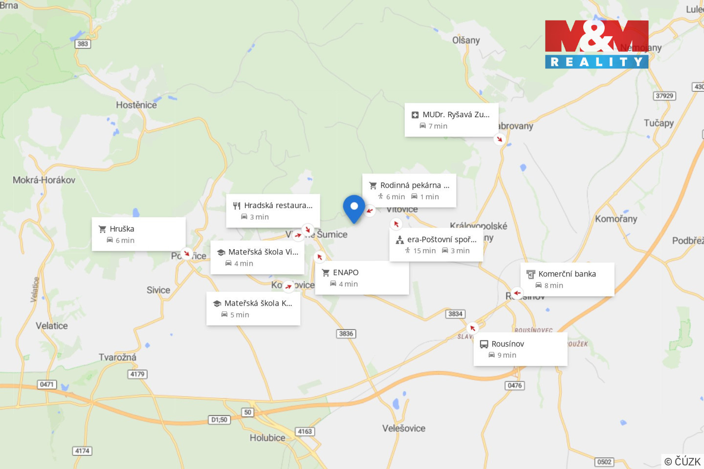 Nabízíme stavební pozemek v klidné části obce Viničné Šumice, na jejím okraji – ideální pro ty, kdo hledají soukromí a přírodu kousek od Brna. Pozemek je převážně rovinatý, pouze v horní části mírně svažitý. Celková plocha nabízí široké možnosti využití – cca 1 500 m² je určeno k zastavění rodinným domem se zahradou, bazénem či garáží, takže si zde můžete vytvořit domov přesně podle svých představ. Pozemek má navíc velmi zajímavý tvar – jeho šířka se směrem do hloubky postupně rozšiřuje, od cca 14,18 m při spodní hraně u komunikace, přes 16,69 m ve střední části až na 21,93 m v horní části u chatky, což nabízí velkou variabilitu při plánování stavby i zahrady. Zbývající část tvoří rozlehlá zahrada se dvěma chatkami – jedna je obyvatelná, vhodná pro letní přespání nebo víkendový odpočinek (stačí menší úpravy), druhá menší chatka může posloužit jako dílna, sklad nebo zázemí pro zahradu. Na hranici pozemku jsou všechny inženýrské sítě – elektřina, plyn, voda i kanalizace.