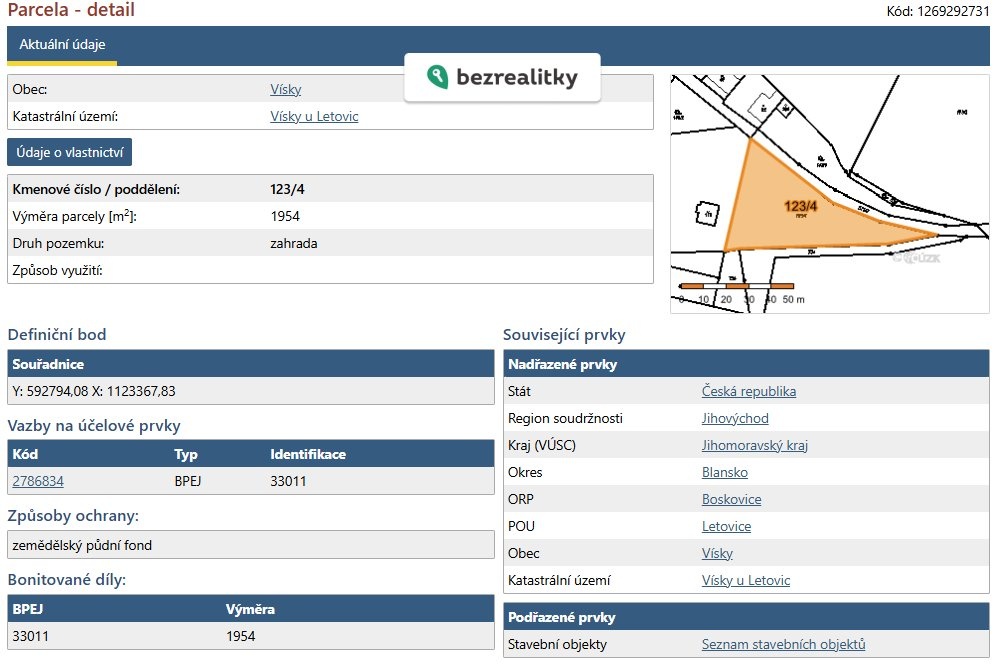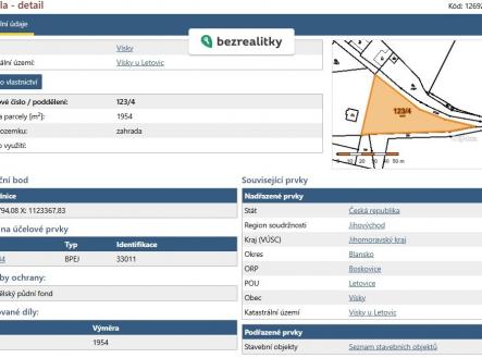 Nabízím k prodeji rovinatou a zcela oplocenou zahradu v osobním vlastnictví v klidné části obce Vísky u Lelekovic o celkové výměře 1 954 m². K pozemku vede asfaltová příjezdová komunikace, před vstupní branou je prostor pro parkování až tří automobilů. Na pozemku se nachází zahradní domek poskytující základní zázemí, do kterého je zavedena elektřina. Elektrická přípojka spolu s telekomunikačním kabelem se nachází přímo na pozemku. Pozemek je celý oplocen a v zadní části osázen ovocnými stromy (jabloně, švestky, blumy). Součástí pozemku bylo také povolení k realizaci vlastní studny, které však nebylo využito. Pozemek je veden v osobním vlastnictví, což zaručuje jednoduchý a transparentní převod bez právních komplikací. Cena je k jednání při rychlém a bezproblémovém převodu. Tato nemovitost je určena výhradně přímým zájemcům o koupi. Na inzerát můžete také reagovat přímo na webu Bezrealitky: https://www.bezrealitky.cz/nemovitosti-byty-domy/936548-nabidka-prodej-pozemku-visky