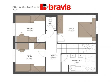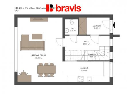Ve výhradním zastoupení majitele Vám nabízíme k prodeji rodinný dům v obci Vlasatice, okres Brno-venkov, v blízkosti přírody a oblasti Pálavy, nádrže Nové Mlýny a zároveň příjemnou dostupností do Brna 25 minut autem. Moderní rodinný dům nabízí dispozici 4+kk s celkovou plochou 117 m2, zahrádku a parkování. Dům je součástí nově vznikající výstavby dvou rodinných domů a k prodeji je pouze již jeden! Plánované dokončení do jednoho měsíce, takže Vánoce již můžete trávit v novém vysněném domě. • Prostorný obývací pokoj s kuchyňským koutem, prosklenými HS portály nabízí dostatek světla a zároveň vstup na terasu a zahrádku. • 3 pokoje - dostatečný prostor pro každého člena rodiny. Interiér domu je navržen s důrazem na kvalitu. • Okna: Hliníkové profily, HS portály - obývací pokoj, troj-skla, venkovní el. lamelové žaluzie. • Podlahy: vinylové podlahy v přírodním dekoru, • Koupelny a WC: velkoformátová keramická dlažba, • Vytápění a ohřev TUV: Podlahové topení v celém domě, solární panely a kondenzační plynový kotel. • Chlazení: příprava pro klimatizaci ve všech místnostech. • Solární panely, díky kterým uspoříte náklady na bydlení. • Bezproblémové parkování u domu. • Energetická náročnost: velmi úsporná - B. Vlasatice jsou vhodným místem pro rodinný život. Klidná lokalita blízko přírody, cyklotrasy a také turistické trasy vhodné k výletům do přírody, rychlá dostupnost do Brna – ideální pro pracující ve městě. V obci je dnes obecní úřad, pošta, knihovna, mateřská a základní škola, obchody s potravinami - COOP. V sousední obci Pohořelice (5 minut) naleznete veškerou občanskou vybavenost. Autobus Brno-Zvonařka - Vlasatice (cca 40 minut), dále směr Therma laa (lázně Rakousko). S financováním Vám rádi pomůžeme. Pro více informací nebo pro sjednání prohlídky kontaktujte uvedeného makléře.