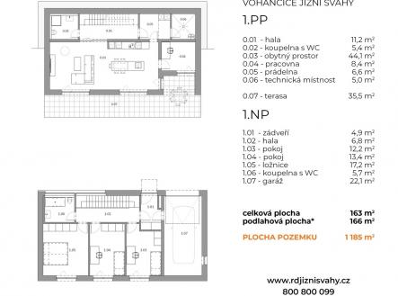 Ve výhradním zastoupení investore nabízíme moderní rodinný dům 5+kk, větší terasou a garáží na okraji malebné obce Vohančice. Nadstandardně řešený a vybavený dům je navržen s důrazem na funkčnost, energetickou úsporu a vysoký komfort pro nové majitele. Dům je součástí menšího developerského projekty, kdy vznikne v klidné slepé ulici pouhých 8 rodinných domů. Vohančice jsou malá obec nacházející se v okrese Brno-venkov v Jihomoravském kraji, asi 25 km severozápadně od centra Brna a 6,5 km od Tišnova. Leží v okouzlující krajině na úpatí Českomoravské a Křižanovské vrchoviny, poblíž řeky Svratky, což dodává okolí příjemný, venkovský charakter. Pozemek celkem: 1.180 m² Užitná plocha: 163 m² Dispozice: 1.PP: hala (11,2 m²), obývací pokoj s kuchyní (44,1 m²), pracovna (8,4 m²), terasa (35,5 m²), koupelna s WC (5,4 m²), prádelna (6,6 m²), technická místnost (5,0 m²) 1.NP: zádveří (4,9 m²), hala (6,5 m²), ložnice (17,2 m²), pokoj (13,4 m²), pokoj (12,2 m²), koupelna s WC (5,7 m²), garáž (22,1 m²)