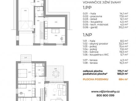 Ve výhradním zastoupení investore nabízíme moderní rodinný dům s garáží na okraji malebné obce Vohančice. Nadstandardně řešený a vybavený dům je navržen s důrazem na funkčnost, energetickou úsporu a vysoký komfort pro nové majitele. Dům je součástí menšího developerského projekty, kdy vznikne v klidné slepé ulici pouhých 8 rodinných domů. Vohančice jsou malá obec nacházející se v okrese Brno-venkov v Jihomoravském kraji, asi 25 km severozápadně od centra Brna a 6,5 km od Tišnova. Leží v okouzlující krajině na úpatí Českomoravské a Křižanovské vrchoviny, poblíž řeky Svratky, což dodává okolí příjemný, venkovský charakter. Pozemek celkem: 680 m² Užitná plocha: 175,7 m² Dispozice: 1.PP: hala (14,1 m²), pracovna (17,6 m²), sklad (12,1 m²), koupelna (4,4 m²), technická místnost (4,5 m²), garáž (30,2 m²) 1.NP: hala (8,5 m²), obývací pokoj s kuchyňským koutem (32,3 m²) a vstupem na terasu (15,3 m²), pokoj (15,4 m²), pokoj (11,6 m²), ložnice (19,3 m²) s terasou (4,3 m²), koupelna s WC (5,7 m²)
