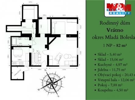 Nabízíme k prodeji samostatně stojící rodinný dům v klidné části obce Vrátno, který je ideální volbou pro rodinné bydlení i rekreační využití. Nemovitost nabízí dostatek soukromí, prostoru i klidu. Dům disponuje užitnou plochou 149 m² na pozemku o celkové výměře 472 m². Dům nabízí budoucím majitelům možnost upravit si bydlení přesně podle vlastních představ. Výhodou jsou již provedené nové rozvody vody a elektřiny. Nemovitost je napojena na obecní vodovod, odpad je řešen jímkou s plánovanou výstavbou obecní kanalizace. Vytápění zajišťují krbová kamna na tuhá paliva, doplněná jsou elektrickými přímotopy. Součástí domu je garáž, dílna a sklep. Autobusové spojení na trase Mladá Boleslav – Mšeno je dostupné přibližně pět minut chůze od domu. Pokud hledáte dům s atmosférou, potenciálem a možností vytvořit si vlastní domov či víkendové útočiště, tato nabídka stojí za vaši pozornost. Pro více informací nebo domluvení prohlídky kontaktujte makléře.