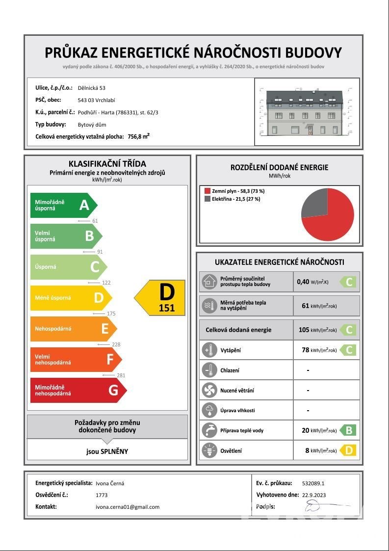 Nabízíme Vám k dlouhodobému pronájmu velmi pěkný podkrovní byt o dispozici 2+kk s celkovou podlahovou plochou 52 m2, který se nachází ve 3. nadzemním podlaží bytového domu ve Vrchlabí Podhůří. Jedná se o moderní bydlení po celkové rekonstrukci v klidné části města s velmi dobrou občanskou vybaveností (Skiareál Kněžický Vrch, sportoviště, bazén, ZŠ a MŠ, obchody, lékaři atd.). Za vstupními dveřmi je předsíň, ze které se vchází do koupelny se sprchovým koutem a toaletou, kuchyně spojené s obývacím pokojem, která je průchozí do ložnice. Kuchyňská linka je plně vybavena vestavěnými spotřebiči (el. sporák s troubou a sklokeramickou deskou, lednicí s mrazákem). V obývacím pokoji spojeném s kuchyní, ložnici a předsíni je na podlaze lepený vinil, v koupelně dlažba. K bytu patří sklepní kóje. Topení pro celý dům zajišťuje plynový kotel a ohřev TUV el. bojler. Okna jsou plastová s trojskly a směrují na západ. Bytový dům je dostatečně zateplen, PENB uvádí energetickou třídu D. Připojení internetu je možné (f. NSYS), není součástí služeb. Na střeše je společná anténa pro příjem televizního signálu. U domu je sdílená zahrada, kterou je možné využít ke grilování či odpočinku. Parkování k dispozici u domu (1x vyhrazené parkovací místo ke každé bytové jednotce). Nájemné činí 13.500, Kč/měsíčně, celková záloha na služby 3.800, Kč/měsíčně (topení, voda, svoz odpadu). Elektřina se bude přehlašovat na nájemníka, předpokládaná výše zálohy 1.500, Kč/měsíčně. Při převzetí bytu hradí budoucí nájemník vratnou kauci ve výši 27.000, Kč a provizi RK ve výši jednoho nájmu + DPH. Bytová jednotka je vymalovaná, uklizená, s možností obsazení ihned. Smlouva se uzavírá na dobu určitou (1 rok) s možností prodloužení. V případě zájmu o více informací či prohlídku kontaktujte makléře.