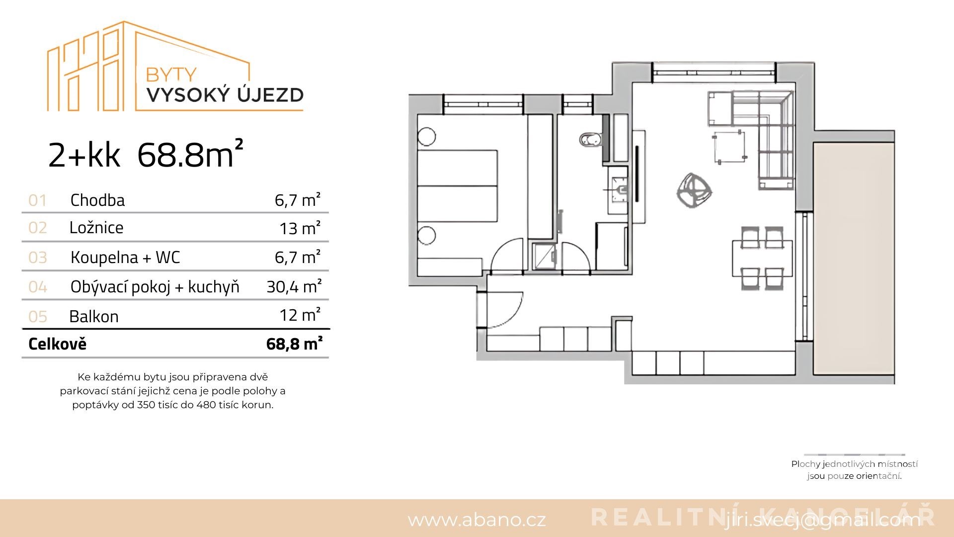 Moderní 2 + kk | 69 m² | Velká lodžie | 2 parkovací stání v ceně / Dokončeno. Jednodušší cestu k vlastnímu bydlení . Moderní, prostorné i pohodové bydlení v novostavbě, vše ve vysokým standardem s výhledem do čisté přírody Českého krasu. Přesto jste v centru moderní rozvíjející se obce s dostupnou občanskou vybaveností 24 minut od centra Prahy. Světlý prostorný obývací pokoj propojený s kuchyní a velkou lodžií s výhledem. Velká okna s venkovními žaluziemi pro regulaci světla a teploty. Podlahy jsou vinylové s dekorem dřeva, což dodá prostoru příjemný vzhled jednotný styl pro celý byt. Velkorysá ložnice, vestavěné skříně pro maximální využití úložného prostoru. Koupelna má moderní design s velkoformátovými dlažbami a dostatek úložného prostoru. Vyhřívané podlahy zajistí komfort i v chladnějších měsících. Lodžie multifunkční prostor využitelný jako relaxační zóna nebo malá domácí zahrádka. Topení a chlazení podlahovým topením vytápěné tepelným čerpadlem ze zemních vrtů zajišťuje komfortní teplotu po celý rok. Tento návrh kombinuje moderní technologie s kvalitními materiály pro maximální pohodlí a nízké náklady. K bytu jsou připravena dvě parkovací stání. ! :) Lokalita & občanská vybavenost Obec: Vysoký Újezd – klidné bydlení na okraji Prahy s výhledem do Českého krasu V pěším dosahu: škola, školka, pošta, prodejna potravin, restaurace Rozvoz potravin: Rohlik.cz, iTesco.cz, Košík.cz Okolí nabízí možnosti sportovního, společenského a turistického vyžití, stejně jako dobré stravování a dostupné nakupování. Golfové hřiště Albatros, cyklo i pěší/turistické trasy v Českém krasu Obec Vysoký Újezd leží za jihozápadním okrajem Prahy ve směru na Beroun. Díky dálnici D5 je Praha v ideální dojezdové vzdálenosti a v druhém směru se obyvatelům obce otevírá čistá příroda Českého krasu. Centrum Prahy20 km, 24 min OC Beroun 7 km, 13 min Letiště V. H. 13 km, 20 min Zavolejte mi ještě dnes a domluvte si osobní prohlídku Nechte si ujit poslední volné byty moderním bydlením s nádechem přírody! Poplatky a zalohy 5000, Kč Kauce jeden nájem