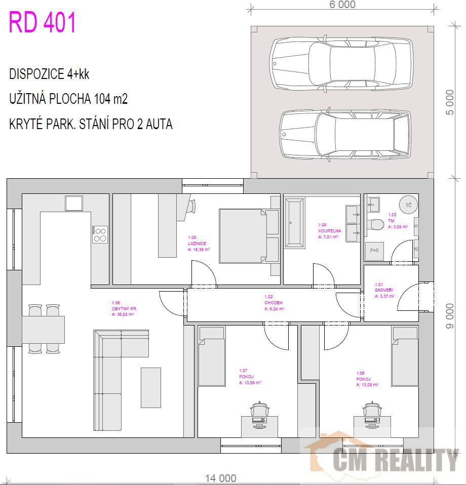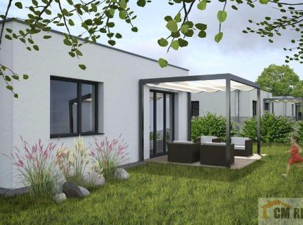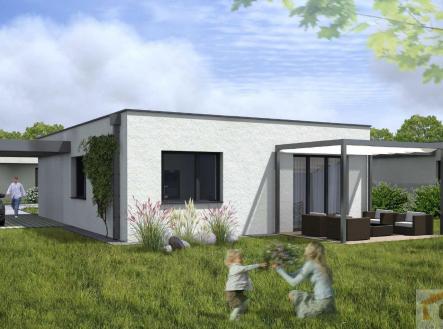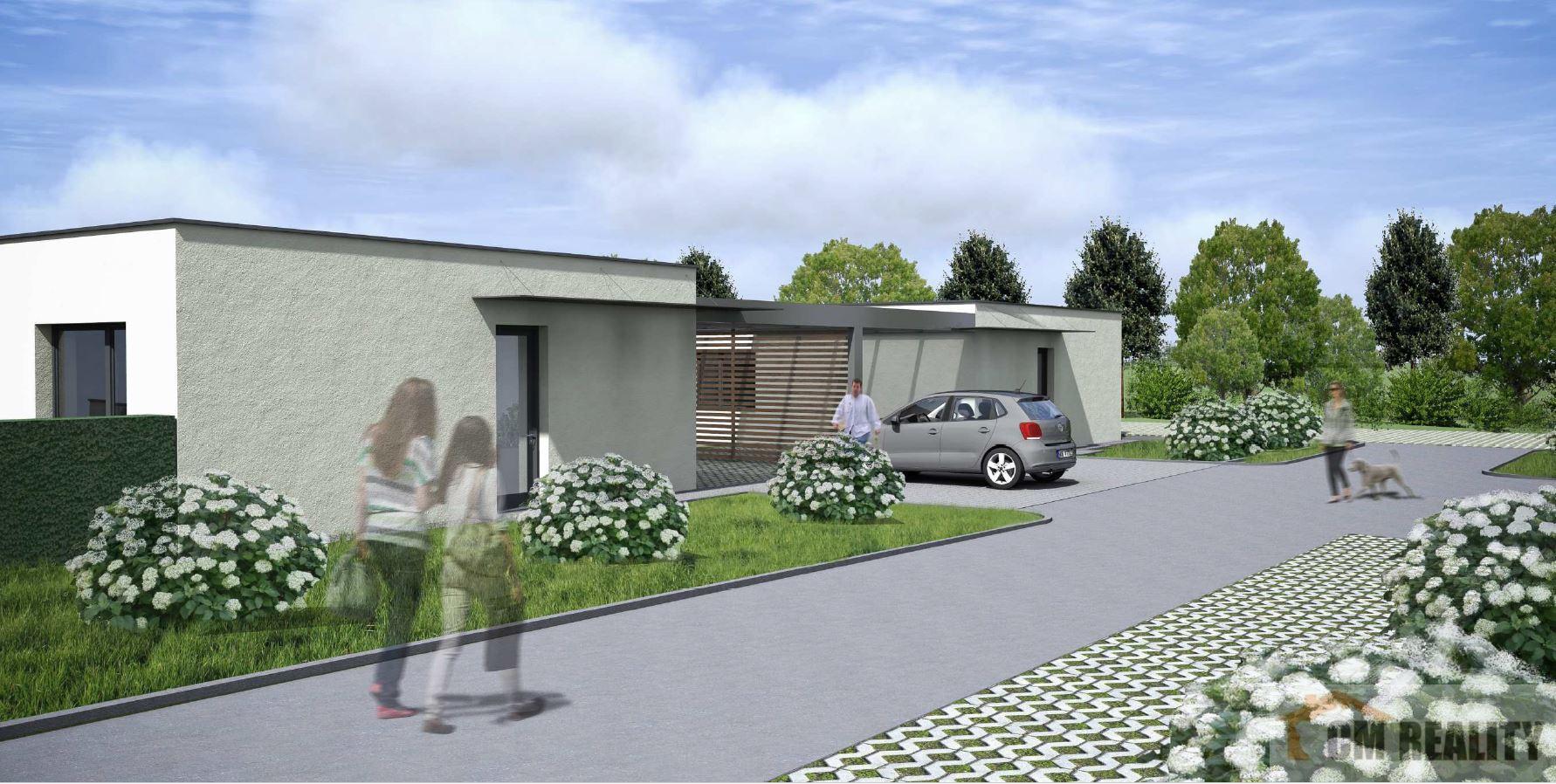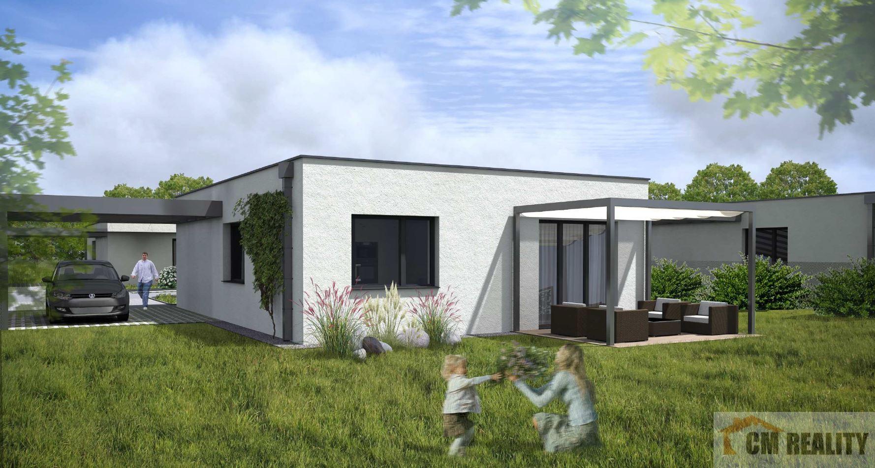 Nízkoenergetický rodinný dům v obci Výšovice. Obec Výšovice se nachází 7 km jižně od centra Prostějova a asi 1,5 km od dálnice Vyškov - Olomouc. Lokalita byla zvolena především z důvodů klidné zóny s dobrou dostupností do města Prostějov. Dispozice domu Dům je navržen jako jednopodlažní s dispozicí 4+kk. Vstup do domu je navržen přes zádveří, ze kterého je přístupná technická místnost s toaletou a dále hlavní chodba domu. Z této chodby jsou přístupny všechny ostatních místností v domě. Po pravé straně jsou vstupy do koupelny a ložnice, po levé straně do dětských pokojů a na konci chodby je vstup do obytné místnosti. Kompozice oken vychází z dispozičního řešení objektu. Ve všech pokojích jsou navrženy velké prosklené plochy tak, aby byl interiér dobře prosvětlen. Z obytného prostoru je pak francouzským oknem umožněn vstup do zahrady. Stavební a materiálové řešení Jedná se o jednopodlažní stavbu zděného stěnového systému. Základovou konstrukci objektu tvoří základové pasy a základová deska. Stavba je vyzděná z keramických bloků HELUZ Family založených na železobetonových základových pasech systému STAVOMODUL. Obvodové zdivo tvoří zároveň svislé nosné konstrukce objektu. Obvodové zdivo je zakončeno železobetonovým obvodovým věncem. Překlady jsou keramické systému HELUZ. Příčky jsou rovněž navrženy ze systému Heluz. Strop je navržen monolitický, plochá střecha je řešená jako vegetační s extenzivní zelení. Přilehlé plochy stavby tvoří zpevněný příjezd ze zámkové dlažby a parkovací stání ze zatravňovacích dlaždic. Parkovací stání bude tvořeno lehkou konstrukcí. Dům bude opatřen bílou fasádní omítkou s kontrastními prvky. Technologické řešení Rodinný dům je navržen v nízkoenergetickém standardu. Vytápění objektu je řešeno systémem teplovodního podlahového vytápění ve všech místnostech, s připojením na tepelné čerpadlo vzduch-voda. Ohřev teplé vody je podpořen fotovoltaickým systémem. V koupelně je příprava pro otopný žebřík. Okenní prvky jsou vybaveny stínícími prvky, aby se zamezilo přehřívání interiéru domu (manuálně ovládané screeny). Zastavěná plocha domu 126 m2, podlahová plocha 104 m2. Pozemek 870 - 943 m2. Cena domu s pozemkem činí 6.490.000,- Kč + 2 % RK ve variantě k dokončení finálních prvků klientem (dům bez interiérových dveří, finálních povrchů podlah, bez obkladů + dlažby v koupelně a na WC, bez sanitárního vybavení, venkovních povrchů a tepelného čerpadla). Cena domu 5.490.000,- Kč + 2 % RK ve variantě Stavba před dokončením (stavba nezahrnuje vnitřní příčky, interiérové omítky, tepelné čerpadlo, jednotku rekuperace, el. rozvaděč a koncové prvky, povrch příjezdové cesty, interiérové dveře, povrchy podlah, obklady a dlažby v koupelně a na WC, sanitární vybavení). Varianta domu na klíč, bez kuchyňské linky, 7.990.000,- Kč + 2 % RK.
