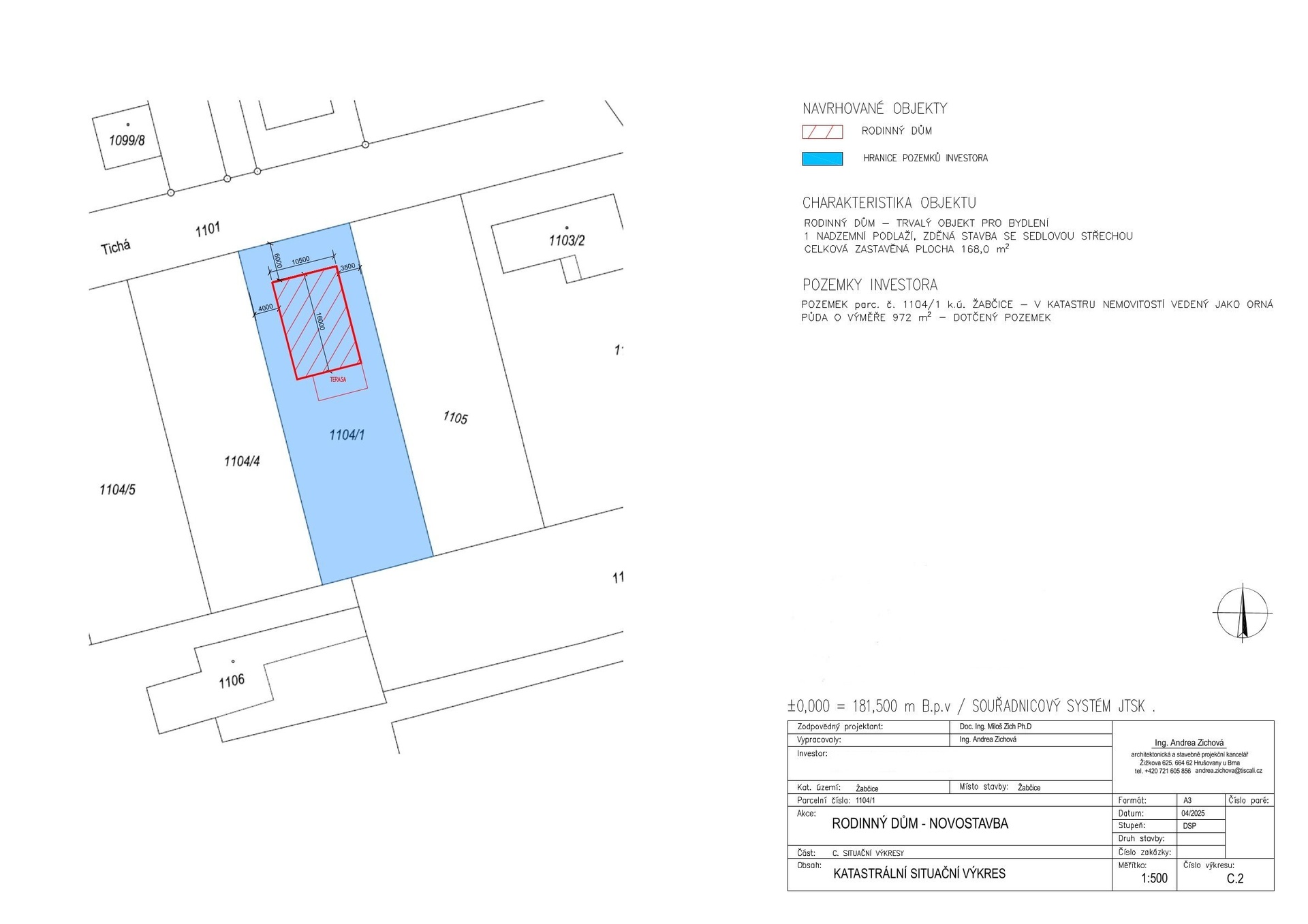 Prodej stavebního pozemku v Žabčicích na klidné ulici Tichá, katastrální území Žabčice, okres Brno – venkov. Pozemek parc.č. 1104/1 o výměře 972 m2 je určen k výstavbě rodinného domu. Jedná se o rovinatý zasíťovaný pozemek obdélníkového tvaru s šířkou 18 m a délkou 54 m, který se nachází na hranici katastru obce Žabčice a Přísnotice a tvoří čtvrť, které se říká Malé Žabčice. Všechny sítě (kanalizace, vodovod, elektřina, plyn, optika) jsou na hranici pozemku. Je tedy možné využít občanskou vybavenost i dopravní spojení obou obcí. Na výstavbu rodinného domu je vypracovaná projektová dokumentace a bylo zažádáno o stavební povolení. Přízemní rodinný dům o velikosti 4+kk s užitnou plochou 138 m2 (zádveří, chodba, 3x ložnice, obývací pokoj s kuchyňským koutem, koupelna, WC s umyvadlem, technická místnost). Projektová dokumentace je k nahlédnutí k dispozici a je součástí kupní ceny. Občanská vybavenost v Žabčicích je na dobré úrovni a zahrnuje základní školu, mateřskou školu, samoobsluhu, poštu, knihovnu, dům s pečovatelskou službou, benzinku, sokolovnu, restaurace a sportoviště, koupaliště, což pokrývá většinu potřeb místních obyvatel. Autem jsou Žabčice z Brna vzdálené cca 30 km (25 min). Město Židlochovice se nachází cca 5 km (7 min) a město Pohořelice cca 8 km (9 min). Dopravní spojení: Žabčice – vlak Brno, Přísnotice – autobus Žabčice – přestup vlak Brno, Žabčice, Přísnotice – autobus Židlochovice, přestup autobus Brno. Odměna zprostředkovatele není zahrnuta v uvedené ceně.