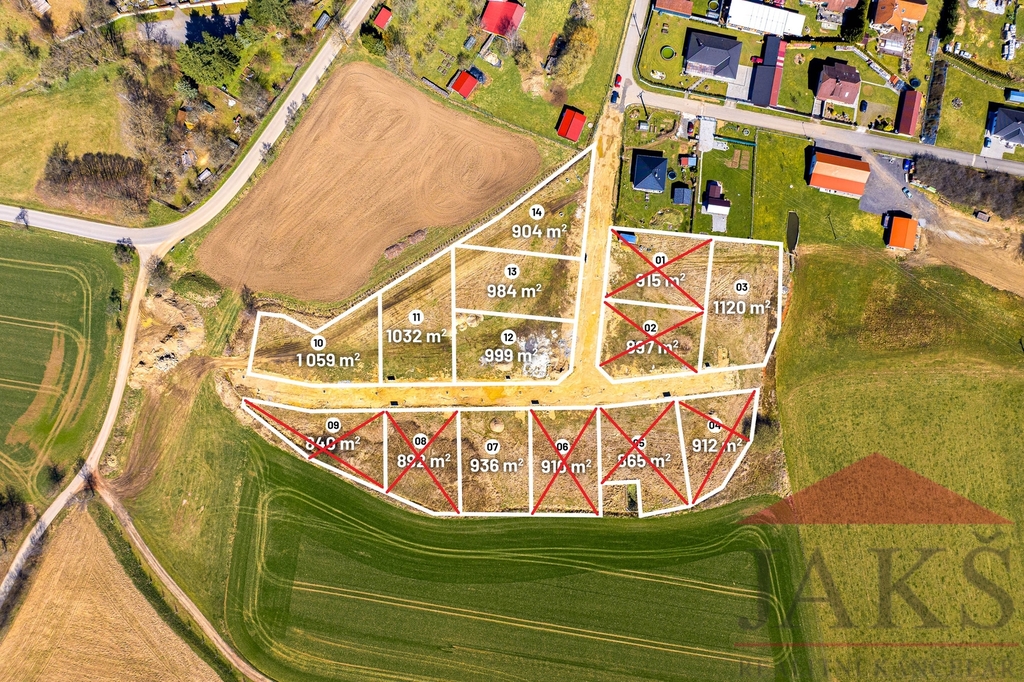 Záboří u Blatné; obecní stavební pozemky (výměry od 904 m2 do 1.120 m2)