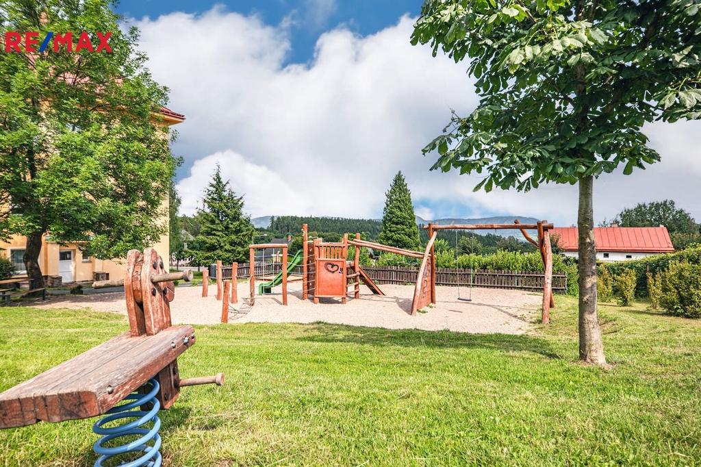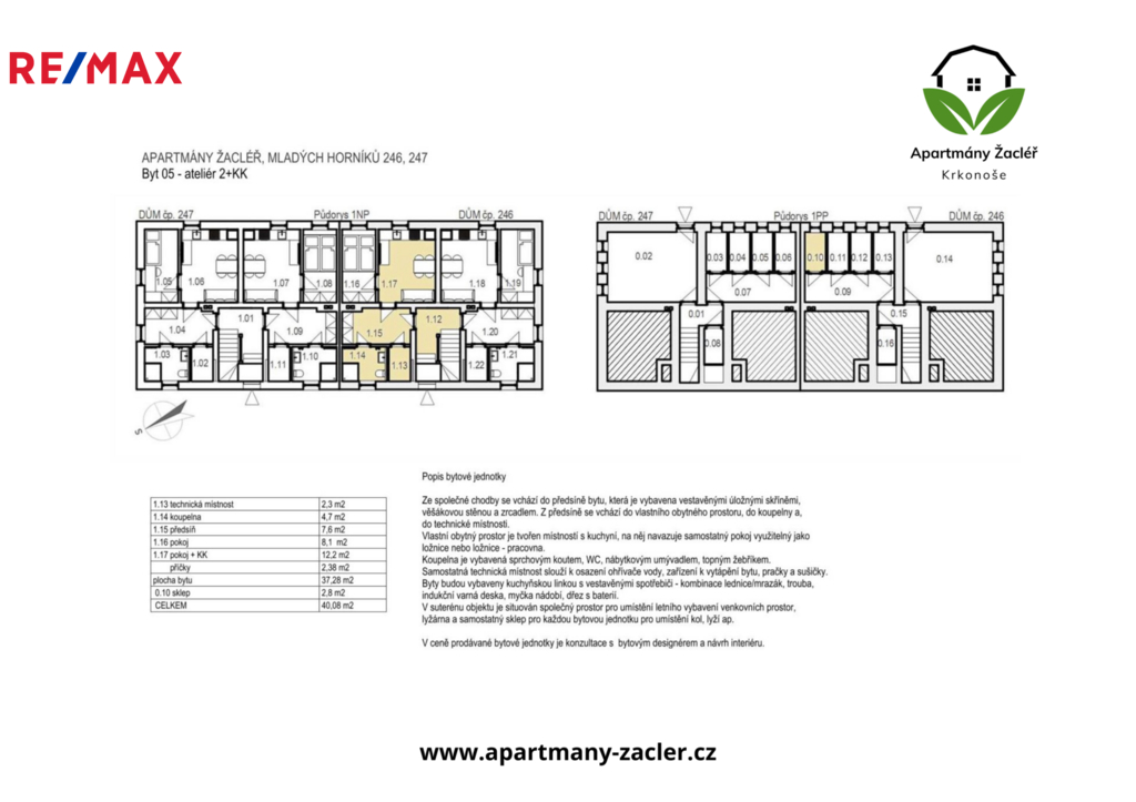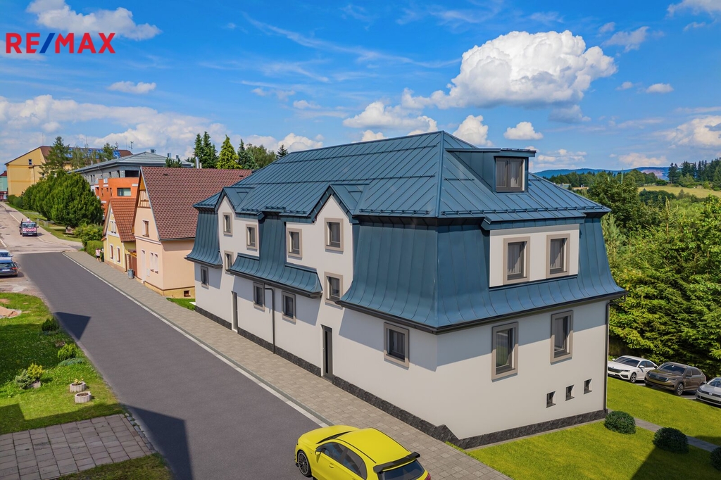 Milujete hory? V létě, nebo v zimě? Toužíte jen tak vyrazit z města na víkend, kdykoliv vás napadne? Bydlení ve vlastním apartmánu v Krkonoších vám poskytne skvělé zázemí, pohodlí a domácí prostředí. Apartmány v malebném městečku Žacléř budou vaší skvělou investicí. Jen pár kroků od historického náměstí se nacházejí nové apartmány k prodeji. Tento apartmán o dispozici 2+kk disponuje podlahovou plochou 37,28 m² a je částečně vybaven nábytkem na míru. V obývacím pokoji je moderní kuchyňská linka s prémiovými spotřebiči značky Siemens (součástí je indukční varná deska, kombinovaná elektrická trouba, zabudovaná kombinovaná lednice, myčka na nádobí šířky 45 cm, digestoř) a granitový dřez. Dekor lamina kuchyňské linky si může zvolit podle vlastního vkusu. Na výběr jsou celkem 4 barevné odstíny: dub/almond, dub/mouse grey, dub/dusk blue a dub/latte. V koupelně je umístěna koupelnová skříňka s umyvadlem, závěsná skříňka v dekoru dub Nebraska, sprchový kout, závěsné WC a otopný žebřík. Každý apartmán má svoji technickou místnost, kde je umístěn bojler na ohřev vody a elektrokotel RAY PROTHERM 6KE s možností dálkového ovládání přes telefon. Celý apartmán je vytápěn pomocí podlahového topení, které je možné libovolně regulovat dle jednotlivých místností. Na podlaze je položena keramická dekorativní dlažba o rozměrech 60x60 cm. Plastová okna jsou jsou z vnitřní strany bílé barvy, vnější antracit a jsou vybavena moderní stínící žaluzií typu plisé. O projektu APARTMÁNY ŽACLÉŘ: Bytový dům ze začátku 20.století prošel kompletní rekonstrukcí, která byla provedena velmi citlivě s ohledem na zachování charakteru a rázu celého objetu. Pro tento dům je charakteristická mansardová střecha, která je zachována a v podkroví doplněna pultovými vikýři pro denní osvětlení interiéru. Střecha má novou konstrukci střešního pláště s krytinou z hliníkového střešního systému Prefalz rakouské firmy PREFA Aluminiumprodukte. Tento systém se vyznačuje naprostou bezúdržbovostí a dlouhou životností. Dům má nové izolace proti vodě a zemní vlhkosti, stávající zdivo je ošetřeno injektáží krémem na bázi silanu. Byty jsou dodatečně zatepleny, osazena jsou nová plastová okna barevně ladící s krytinou střechy a bude mít také novou venkovní fasádu s klempířskými prvky navazujícími na střešní krytinu. V domě je celkem 8 apartmánů o dispozici 2+kk. Vybírat můžete mezi klasickým bytem a mezonetem. Apartmány budou zkolaudovány jako bytové jednotky. Na návrhu řešení interiéru se podílel bytový designér a každý apartmán tak bude již vybaven nábytkem na míru. V suterénu objektu jsou společné prostory pro uložení letního vybavení venkovních prostor, dále lyžárna a samostatné sklepy ke každé bytové jednotce. K domu náleží zahrada v zadní klidové části za domem, kde bude vytvořen prostor pro venkovní posezení, grilování apod. Na klidovou zónu bude navazovat parkoviště s možností vlastního venkovního parkovacího místa pro každý byt.
