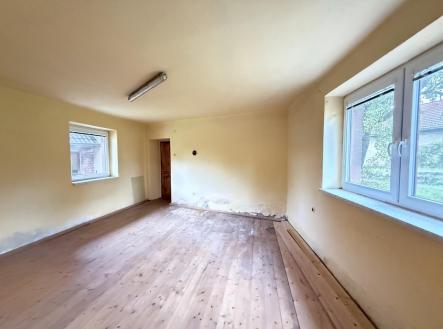 Nabízíme k prodeji rodinný dům o dispozici 3+KK v klidné obci Zaječice, vzdálené pouhých 7 km od Chrudimi. Nemovitost se nachází na pozemku o celkové výměře 418 m2, z toho zastavěná plocha činí 140 m2, obytná část má rozlohu 90 m2. Dům ve tvaru L je postaven z kombinace kamene a cihel, střecha je sedlová s betonovou krytinou Bramac. Plastová okna s izolačním dvojsklem, střešní krytina i venkovní kolna byly rekonstruovány přibližně před 15 lety. Objekt je částečně podsklepen, sklep má výměru cca 35 m2. Dispozičně dům nabízí prostorný obývací pokoj s kuchyňským koutem (27,5 m2), ložnici (19,1 m2), druhou ložnici (23,5 m2), verandu (6 m2), chodbu (9,1 m2), samostatné WC (1,5 m2) a koupelnu (2,8 m2). Na obytnou část navazují hospodářské stavby stodola využívaná jako sklad dřeva (cca 23 m2), bývalý chlév přestavěný na sklad (cca 12 m2) a přístřešek umístěný na hranici dvora. Dům je napojen na elektřinu (světelný i motorový okruh). Voda je čerpána z vlastní kopané studny o hloubce 5 metrů a prostřednictvím domácí vodárny, umístěné ve verandě, je rozvedena do kuchyně, koupelny, WC a jednoho z pokojů. Ohřev vody zajišťuje elektrický bojler. Odpad je sveden do septiku o objemu cca 3,5 m3. Vytápění domu je řešeno kamny na tuhá paliva. Tato nemovitost představuje ideální příležitost pro ty, kteří hledají dům k rekonstrukci s potenciálem pro trvalé bydlení, rekreační účely nebo jako investici. Díky klidné lokalitě a výborné dostupnosti do Chrudimi nabízí spojení venkovského klidu s městským komfortem.