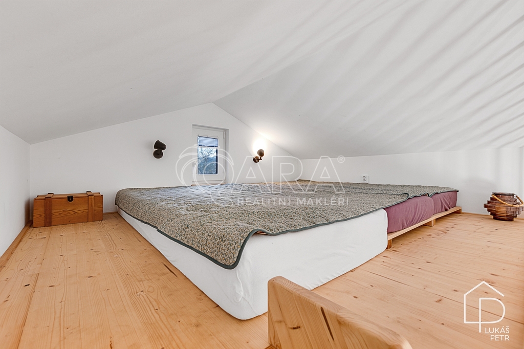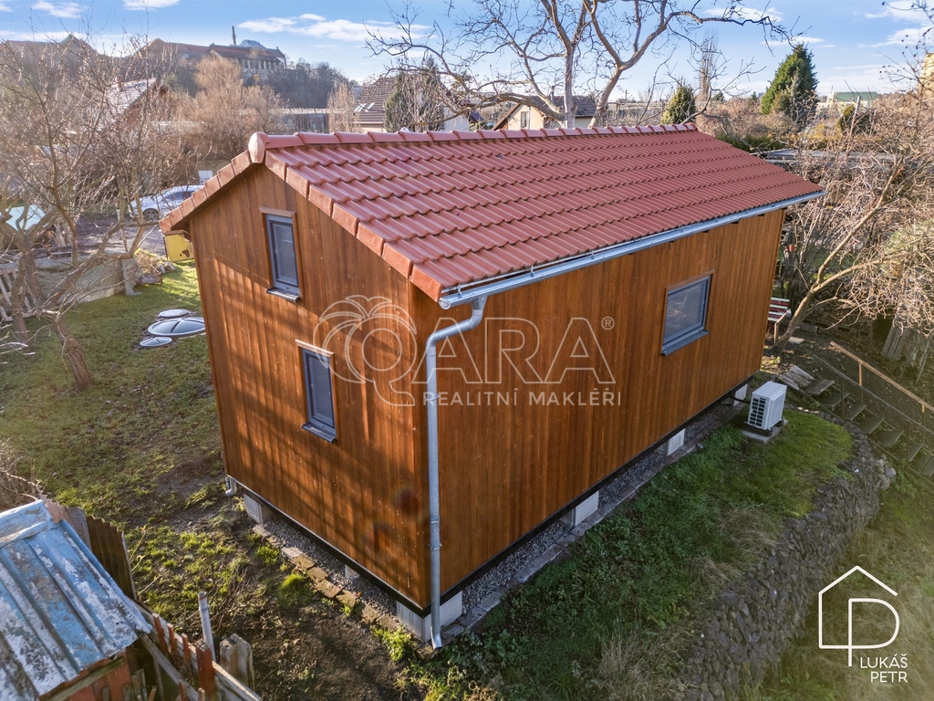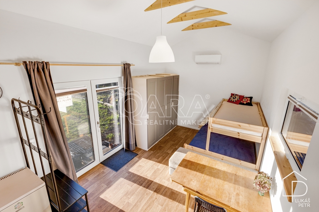 Celoroční tiny house s mezipatrem, který není řešený jako sezónní chatka, ale jako poctivě postavená stavba s normální skladbou konstrukcí a technikou, která dává smysl i pro dlouhodobé užívání. Dům má délku 8 metrů, zastavěnou plochu 28 m² a díky mezipatru vychází užitná plocha zhruba na 32 m². Půdorys je navržený účelně a interiér je využitý do posledního metru. Dům je starý zhruba jeden rok a je ve stavu téměř novostavby. Přízemí tvoří hlavní obytný prostor s kuchyňským zázemím a místem pro jídelní stůl, navazuje schodiště na mezipatro a v zadní části je koupelna se sprchou a WC. Mezipatro je pochozí a slouží jako spací zóna, přičemž má denní světlo z oken ve štítu. Výhodou je oddělení denní a klidové části, což je u podobných staveb věc, která se projeví hlavně v běžném provozu. Z hlediska provedení je dům postavený poctivě a bez zbytečných kompromisů. Konstrukce i skladby odpovídají celoročnímu použití, dům dobře drží teplo a zároveň se dá rychle vytopit. Koupelna je řešená jednoduše a prakticky, s důrazem na snadnou údržbu. Fasáda je dřevěná, střecha má klasickou taškovou krytinu. Dům je světlý, ale nepůsobí přehnaně proskleně. Hlavní obytný prostor má velké dveře ven, doplněné o menší okna tam, kde dávají smysl. O teplotní komfort se stará klimatizační jednotka Daikin s možností vytápění, ovladatelná přes WiFi. Elektroinstalace je řešená přehledně a s rezervou, včetně samostatných okruhů pro jednotlivé spotřebiče a venkovní zásuvky. Celkově jde o dům, který nevyžaduje žádné dodělávky ani improvizace po nastěhování. Dům je určený k osazení na patkách, s minimálním větracím prostorem pod stavbou cca 0,25 m. Za splnění podmínek nového stavebního zákona lze na stavbu tohoto typu nahlížet jako na drobnou stavbu, vždy v závislosti na konkrétním umístění. Tiny house je vhodný pro celoroční bydlení, rekreaci i jako investice na pronájem. Kombinace oddělené spací zóny, rozumné skladby a techniky, která není na hraně možností, je přesně to, co u těchto staveb rozhoduje. Pokud vás o nabídce zajímá více informací, rád vám pošlu odkaz s dalšími podklady a plány.