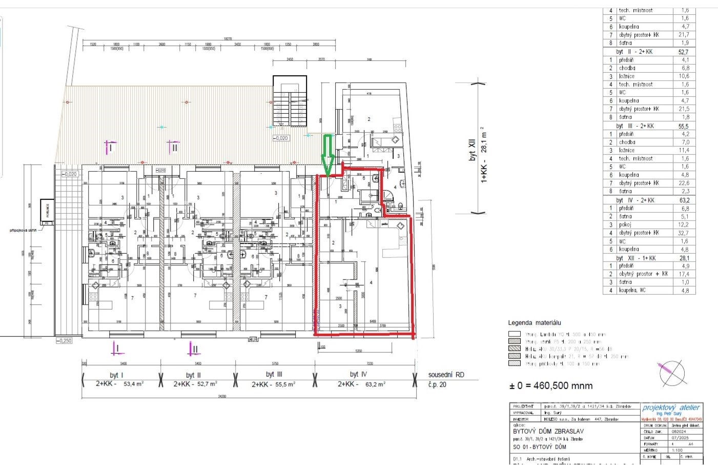 Byt 2+kk ve Zbraslavi u Brna! Nabízíme k prodeji poslední byt 2+kk o výměře 63,2 m2, v moderní novostavbě ve Zbraslavi u Brna. Ke každému bytu náleží sklepní kóje a je zde možnost dokoupit vlastní parkovací stání přímo v areálu rezidence vybavené přípravou na nabíjecí stanici pro elektromobil. Výstavba projektu probíhá dle harmonogramu – aktuálně se dokončují se vnitřní omítky, pokračují práce na venkovních omítkách. Kolaudace je plánována na jaro 2026, předání bytu bude včetně finálních povrchů podlah, interiérových dveří, sanitárního vybavení a přípravy na kuchyňskou linku. Ještě posledních pár dnů máte možnost výběru dekorů z kvalitních standardů. Dům spadá do energeticky úsporné třídy B – bude zde kvalitní zateplení střechy minerální vlnou, okna s izolačními trojskly, venkovní žaluzie, fotovoltaické solární panely na střeše apod. To vše zaručuje velmi nízké provozní náklady. Jako příjemný bonus je pro rezidenty zajištěna možnost pronájmu zahrádky v blízké obecní zahrádkářské kolonii. Bytový dům se nachází přímo v centru obce, v pěší dostupnosti obecního úřadu, pošty, lékárny, mateřské i základní školy. V obci dále najdete praktického lékaře, zubaře, obchody, restauraci, kulturní dům, knihovnu a další občanskou vybavenost. Zastávka autobusu je jen 50 metrů od domu, cyklostezka cca 150 metrů. Výborná dostupnost na dálnici D1 zajišťuje rychlé spojení s Brnem i okolím. Tento architektonicky zdařilý projekt přináší ideální spojení klidného bydlení, výborné dostupnosti a moderního standardu za velmi příznivou cenu. Pro více informací kontaktujte realitní makléřku. Ráda vám poskytne podrobné informace i nabídne možnost výhodného financování s naší odbornou hypoteční specialistkou.