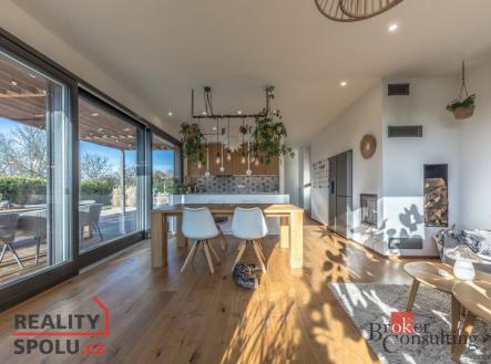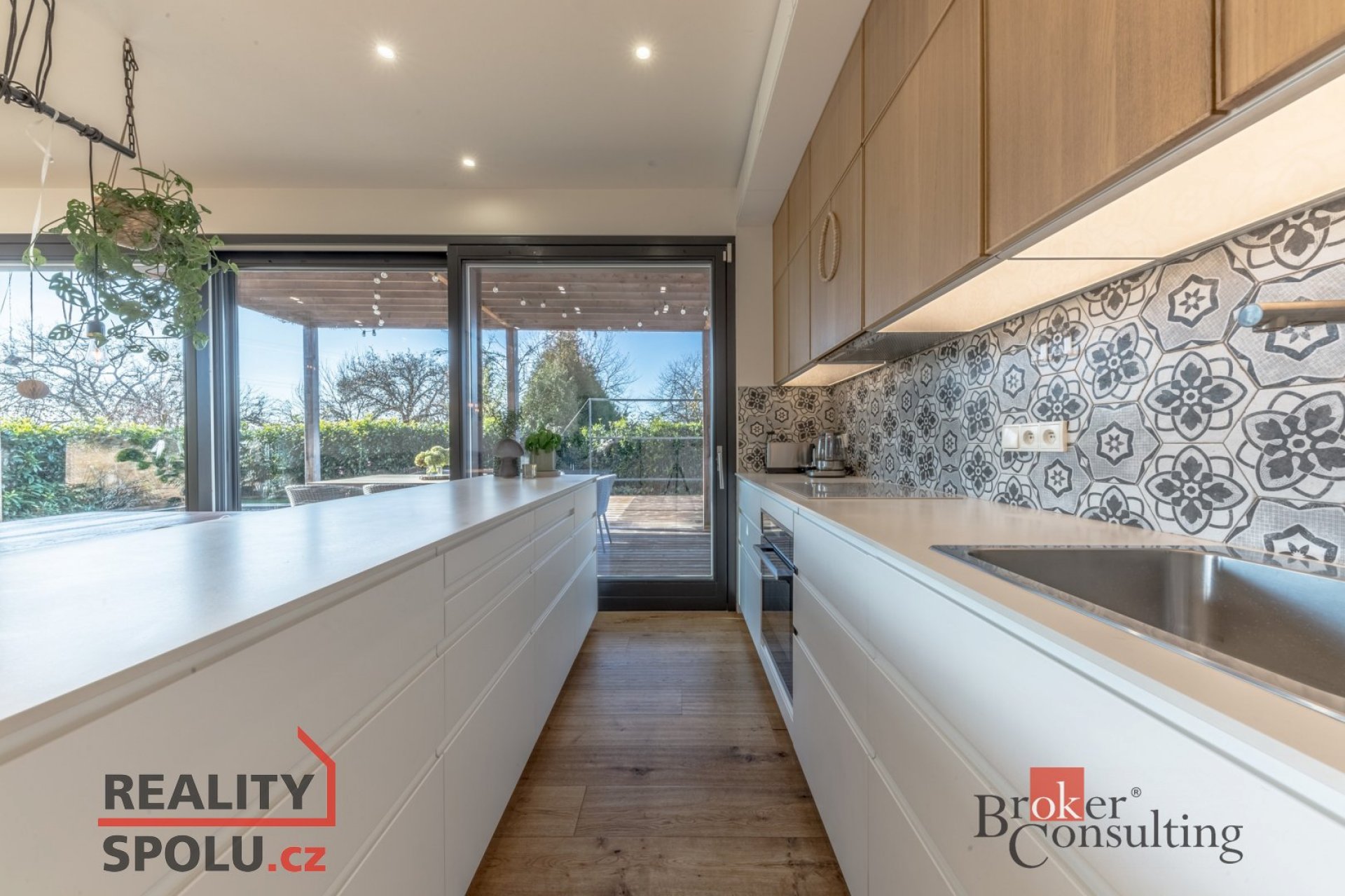 Exklusivně nabízíme ke koupi moderní dřevostavbu z roku 2019, která je postavena na výjimečně klidném místě na okraji Prahy, Zdiby - Brnky. Rozlehlá, rovinatá a pečlivě upravená zahrada, zajišťující maximální soukromí i přímý kontakt s okolní přírodou. Dům je situován ve vyvýšené poloze nad údolím Vltavy, v těsné blízkosti Draháňského údolí a přírodního parku, přesto s rychlým spojením do do hlavního města. Užitná plocha domu činí 140 m2, pozemek celkem 1 005 m2 (z toho zahrada činí 935 m2 a zastavěná plocha 70 m2). Dominantou přízemí je otevřený obytný prostor s obývacím pokojem, jídelnou a kuchyní, který je přímým vstupem propojen s terasou a zahradou. Dále se zde nachází předsíň, technická místnost a koupelna se sprchovým koutem a toaletou. V horním patře je situována hlavní ložnice se šatnou, tři další samostatné pokoje a druhá koupelna s vanou a WC. Interiér domu je laděn do svěžího, moderního stylu a je krásně prosvětlen množstvím francouzských oken s izolačními trojskly, která zároveň nabízejí dechberoucí výhledy do zeleně. O útulnou atmosféru se starají krbová kamna, tepelný komfort pak zajišťuje podlahové topení se samoregulační funkcí. Střešní okna jsou vybavena venkovními termo roletami i vnitřním zatemněním, venkovní žaluzie jsou ovládány elektronicky. Vytápění je zajištěno elektro kotlem a ohřev bazénu je prostřednictvím tepelného čerpadla, jsou zde velmi nízké provozní náklady (PENB se dokončuje). Dům je chráněn bezpečnostním systémem. Napojen je na veřejný vodovod, zároveň disponuje vlastní studnou i retenční nádrží na dešťovou vodu. Odpadní vody jsou řešeny domovní čističkou. Zahrada je rozdělena na relační a užitkovou část. V relaxační zóně nechybí terasa, pergola, ani vyhřívaný bazén se slanou vodou o rozměru 3 × 8 m, který lze zakrýt pojízdnou dřevěnou terasou. V užitkové části jsou vyvýšené záhony, skleník a dostatek prostoru pro pěstování. Údržbu usnadňuje automatický zavlažovací systém i robotická sekačka. Součástí pozemku je také zahradní domek s dílnou a 3–4 parkovací stání. Lokalita nabízí jedinečné spojení klidu přírody a pohodlí města. Nachází se v těsném sousedství Prahy, s možností využívat kompletní občanskou vybavenost jak ve Zdibech, tak v hlavním městě. V bezprostředním okolí se nachází příroda, pole, lesy a cyklostezky, ideální pro procházky, běh, jízdu na kole, venčení psa či rodinné výlety. Nesmíme opomenout nedaleké Drahanském údolí, které lze poznávat pěšky i na kole, či oblíbená cyklostezka podél Vltavy. Milovníci sportu ocení sportovní hřiště, fitness centra a další sportoviště v okolních obcích i v Praze, která je vzdálena jen několik minut jízdy autem. Pokud hledáte domov, který vám nabídne klid, prostor, soukromí i vysoký komfort bydlení v jedinečné lokalitě, je tato nabídka určena právě vám. Přijďte se osobně přesvědčit o jedinečné atmosféře tohoto místa – rádi vás domem provedeme.