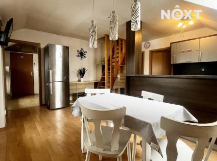 Stylový mezonetový byt s dostatkem prostoru a světla, 84 m² Nabízíme k prodeji mezonetový byt s funkční dispozicí, vybavený a rozložený do dvou podlaží. Po vstupu do bytu se nachází vstupní chodba, ze které je přístup do jednotlivých místností. V bytě se nachází samostatná koupelna s vanou, umyvadlem a místem pro pračku a sušičku, a dále oddělené WC. Hlavní obytnou část tvoří kuchyně vybavená spotřebiči, propojená s jídelnou, která plynule navazuje na obývací pokoj. Prostor je řešen otevřeně, nabízí dostatek místa pro běžný provoz domácnosti i posezení. Součástí spodního patra je také samostatný pokoj, vhodný jako dětský pokoj, pracovna nebo pokoj pro hosty. Do horního patra vede schodiště, kde se nachází ložnice .Patro je odděleno od denní části bytu a poskytuje klidovou zónu pro spaní nebo práci. Součástí prodeje je vybavení bytu, tak jak je patrné z fotografií. K bytu náleží také sklepní prostor, vhodný pro uložení sezónních věcí nebo dalšího vybavení, a další společné vnitřní i venkovní prostory. Součástí prodeje bytu je také parkovací místo za domem, s možností vybudování kryté garáže. Byt je v udržovaném stavu, vhodný k okamžitému užívání bez nutnosti zásadních investic. Díky své dispozici je vhodný pro rodinu, pár i jako investici. Obec Zdounky nabízí kompletní občanskou vybavenost a zároveň klidné bydlení v blízkosti přírody. Velkou předností je okolní krajina a blízkost Chřibské vrchy, ideální pro procházky, cyklistiku i aktivní odpočinek. Pokud vás tento byt zaujal, neváhejte mě kontaktovat a domluvíme si prohlídku. Pro komunikaci uvádějte evidenční číslo zakázky N116138.
