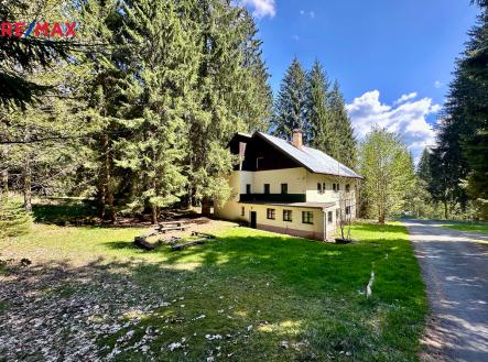 Exkluzivně nabízíme zcela unikátní nemovitost, která nabízí široké možnosti využití. Dům s číslem popisným čp.9, se souborem okolních pozemků (o celkové výměře 15 757 m2) s možností další výstavby bytových domů či penzionu. Penzion má velkou jídelnu, kuchyň, technické zázemí a 10 pokojů, které lze při přestavbě zvětšit. Jedinečná lokalita s výjimečným umístěním nemovitosti na okraji obce Špičák u vlastního lesa, s komorní atmosférou, přímo při pěší asfaltové cestě na ledovcová jezera – Čertovo jezero a Černé jezero. Skiareál Špičák je vzdálen cca 800 m. K nemovitosti vede zpevněná komunikace, která je v zimě udržovaná, s dobrým příjezdem k domu. Voda je využívaná z vydatné studny, kanalizace je na hranici pozemku (nyní je dům napojen na septik), plyn je vzdálen cca 200 m. Jedinečná nabídka, nádherné tiché místo, doporučuji prohlídku.