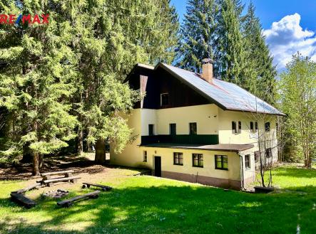 Exkluzivně nabízíme zcela unikátní nemovitost, která nabízí široké možnosti využití. Dům s číslem popisným čp.9, se souborem okolních pozemků (o celkové výměře 15 757 m2) s možností další výstavby bytových domů či penzionu. Penzion má velkou jídelnu, kuchyň, technické zázemí a 10 pokojů, které lze při přestavbě zvětšit. Jedinečná lokalita s výjimečným umístěním nemovitosti na okraji obce Špičák u vlastního lesa, s komorní atmosférou, přímo při pěší asfaltové cestě na ledovcová jezera – Čertovo jezero a Černé jezero. Skiareál Špičák je vzdálen cca 800 m. K nemovitosti vede zpevněná komunikace, která je v zimě udržovaná, s dobrým příjezdem k domu. Voda je využívaná z vydatné studny, kanalizace je na hranici pozemku (nyní je dům napojen na septik), plyn je vzdálen cca 200 m. Jedinečná nabídka, nádherné tiché místo, doporučuji prohlídku.