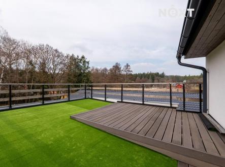 Hledáte bydlení někde v centru dění? Pár minut od zastávky MHD a se školou a školkou ve vedlejším bloku? Chcete večer zabouchnout dveře od domova a krátkou procházkou si dojít na pizzu a skleničku prosecca? Cestou zpět domů pak sledovat večerní život v ulicích, cinkání tramvají a podobně? Tak to jste tady špatně :-). Tady pro Vás máme naprosto něco odlišného. Něco, co však jen budete jen velmi těžko hledat, něco co není zcela běžně v nabídce. Něco co pohladí Vaši duši klidem, tichem a možností koukat celý den do zeleně. Něco co Vám umožní ranní sluníčko přivítat vydatnou snídaní a výbornou kávou na jedné z teras. A místo spalin z výfuků budete dýchat čerstvý vzduch. A místo cinkání tramvají a troubení nervózních řidičů, budete poslouchat zpěv ptáků. Pak se v klidu uvelebíte a můžete pracovat celý den v přírodě, aniž byste museli vytáhnout paty z bytu. Večer si pak (na druhé terase, to aby ji nebylo smutno :-) ) rozpálíte gril, otevřete lahev skvělého vína a den ukončíte stejně jako jste ho začali. V klidu, tichu a naprosté pohodě. Novostavba bytu je umístěna v uzavřeném areálu, kam mají přístup pouze vlastníci bytů, jejich návštěvy a nebo popřípadě návštěvníci, pobývající v některém z bytů na víkend či odpočinek. V areálu jsou dva objekty se třemi a čtyřmi byty. Náš byt je umístěn v tom větším objektu, s přístupem v přízemí, ale celou hlavní dispozicí v 1. patře. Má dispozici 3+KK a výměru 63 m², bez teras. Ty jsou k dispozici dvě, první a větší (39 m²) je přístupná z (aktuálně) ložnice. Na druhou terasu (využitelných 18 m²) vstoupíte z hlavního obytného prostoru. Ta je vizuálně společná se sousedními byty. Kromě hlavního obytného prostoru je zde ložnice, dětský pokoj a koupelna s toaletou. Byt současný majitel využívá byt pro občasné víkendové pobyty a vybavení, které vidíte na fotografiích je po domluvě a v případě zájmu k dispozici. Video a fotografie samozřejmě napoví, ale atmosféru tohoto místa musíte fakt zažít. Vůni lesa a ticho, které zde panuje, zažijete na prohlídce, na kterou vás vřele zveme (naplánujete si čas s Petrou Lehkou +420 739 011 921). Pro komunikaci uvádějte evidenční číslo zakázky N117130.