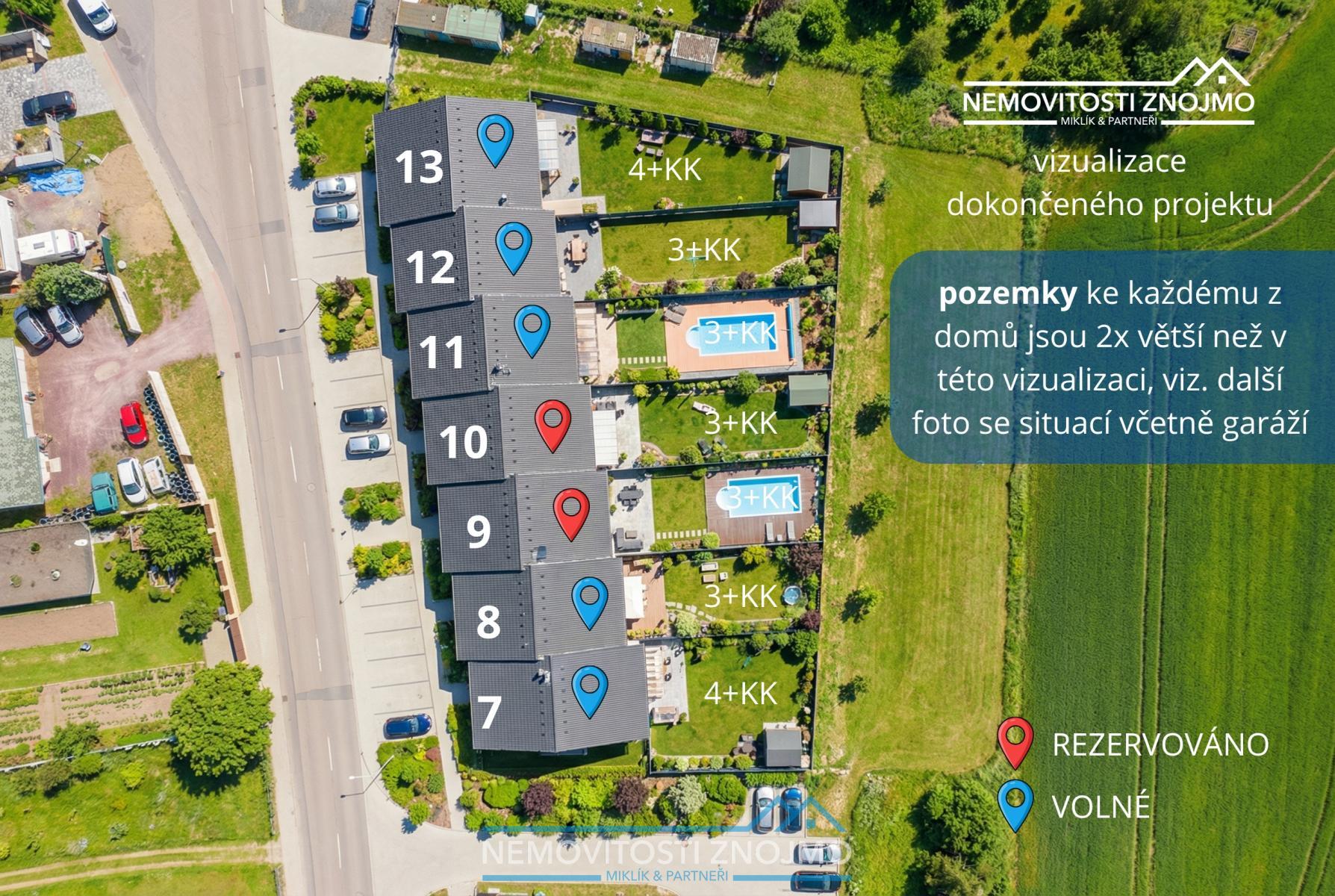 K prodeji nabízíme nadstandardní rodinný dům 3+kk (č. 11), 75m2, s pozemkem 385m2, v k.ú. Načeratice u Znojma. Domy jsou stavěné v absolutním nadstandardu, co to znamená a co vše je zahrnuto v ceně: - před domem zámková dlažba pro dvě auta - kuchyňská linka na míru od truhlářství Rehberger - venkovní elektrické žaluzie - kompletní finální úpravy (podlahy, koupelna včetně nábytku) - v domě bude 2x wc (1x koupelna, 1x technická místnost) - vnitřní obložkové dveře - vestavěná krbová vložka - terasa 15m2 - klimatizace v každé místnosti (topí i chladí) - krbová vložka - podlahové vytápění - designové stěrky na zdech Aktuálně jsou rezervované domy č. 9 a 10. Ze 7 RD je tedy k dispozici posledních 5 domů. Dispozice domů: - Krajové domy 2x: 4+kk - Vedle nich menší domy 2x: 3+kk se zastřešenou terasou - Prostřední domy 3x: 3+kk bez terasy (větší obývací prostor) - Každý dům je stavěný s vlastní zdí, a mezi domy je ještě izolace, čili se jedná o jednotlivé domy, spojené pouze vizuelně fasádou Předpokládaná kolaudace: cca 1. 5. 2026 Další možnosti dokoupení: - podíl na zadní asfaltové cestě: 150.000 Kč - garáž 18 m2 s elektřinou (pravděpodobně i s vodou) : 800.000 Kč - dvojgaráž 36 m2: 1.500.000 Kč - dům nebude oplocený, řešit se bude v rámci dokončení oblasti s kupujícími, předběžně že každý bude hradit jednu stranu plotu. Aktuální nabídka domů: - RD 7 - 4+kk, krajový pravý, pozemek 354 m2, cena 8.990.000 Kč - RD 8 - 3+kk s terasou, pozemek 349 m2, cena 7.870.000 Kč - RD 9 - 3+kk prodloužená terasa, pozemek 364 m2, cena 7.990.000 Kč - REZERVOVÁNO - RD 10 - 3+kk prodloužená terasa, pozemek 372 m2, cena 7.990.000 Kč - REZERVOVÁNO - RD 11 - 3+kk, prodloužená terasa, pozemek 380 m2, cena 7.990.000 Kč - RD 12 - 3+kk s terasou, pozemek 385 m2, cena 7.870.000 Kč - RD 13 - 4+kk, krajový levý, pozemek 631 m2, cena 9.590.000 Kč V rámci fotografií již také vidíte jak vypadají hotové domy od developera zevnitř, jelikož stejný developerský projekt již stavěl v Hevlíně i Dyjákovičkách. Pro bližší informace, půdorysy či termíny prohlídek, kontaktujte pana Ing. Miklíka, volat můžete kdykoliv, včetně víkendů a svátků.
