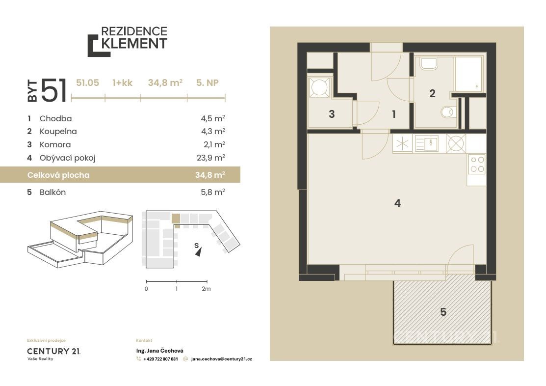 Přijďte si společně se mnou prohlédnout prosluněný byt k pronájmu o dispozici 1+kk a ploše 36m². Byt se nachází v novostavbě Rezidence Klement na ulici Kotkova ve Znojmě. Kromě dobře řešené dispozice a vysokého standardu je jeho velikou předností beze sporu i balkon do vnitrobloku o výměře 6m² a komora, kde je mimo oči návštěvy umístěn bojler a přívod na pračku. Byt se nachází v 5. NP s okny i balkonem orientovanými na jihovýchod. Je nabízen následovně vybaven: spotřebiči vybavená kuchyňská linka, předsíňová stěna, koupelna s toaletou a sprchovým koutem, bojler na ohřev vody, klimatizace (s možností topení v chladném období). Byt je vytápěn elektrickým podlahovým topením. K dispozici je také sklepní kóje a výstup do patra zajišťuje krom schodiště i moderní výtah. V případě zájmu je možné pronajmout i garážové stání. Cena nájmu je 11 500 Kč měsíčně + zálohy na energie 3 500 Kč. Majitel požaduje kauci ve výši 3 měsíčních nájmů, tj. 34 500 Kč Odměna RK je ve výši jednoho měsíčního nájmu + 21% DPH, tj. 13 915 Kč Jedná se o skutečně nadstandartní bydlení nedaleko centra Znojma v polyfunkčním domě, v pěší vzdálenosti od obchodních domů Albert a Lidl, stejně tak i na autobusové nebo vlakové nádraží. Atraktivitu tohoto bytu charakterizuje blízkost centra i Vídeňské třídy, což zajišťuje bezproblémovou dostupnost do Vídně i do Brna. Neváhejte si zavolat o prohlídku.