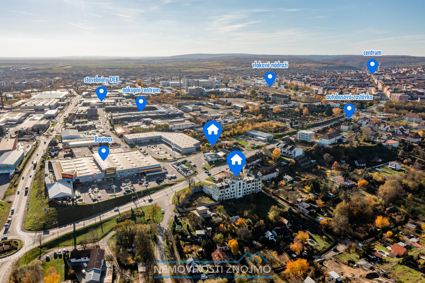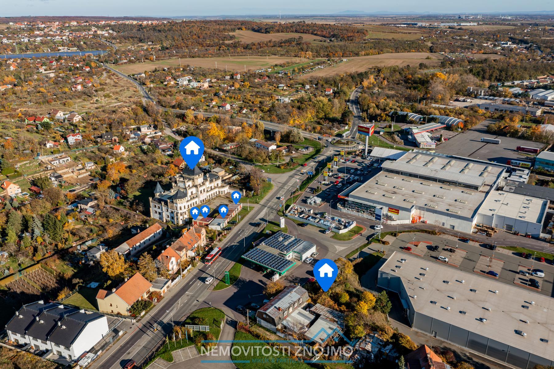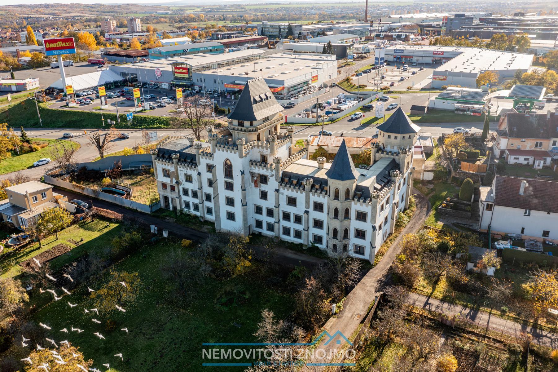 K prodeji nabízíme unikátní soubor komerčních nemovitostí, na ulici Suchohrdelská ve Znojmě, pojďmě si shrnout, kterých 5 klíčových nemovitostí je předmětem této nabídky: 1) 6ti podlažní stavba neogotického zámku vhodná pro ubytování, či jako zázemí větší firmy, zapsaná v katastru jako stavba občanské vybavenosti 2) tato stavba o zastavěné ploše 330m2, se rozprostírá na pozemku o celkové rozloze 2991m2 3)stavební pozemek přes silnici, o výměře 512m2, který také spadá v územním plánu do ploch W - tzn. plochy komerční vybavenosti (obchod, ubytování, stravování, služby, vědu a výzkum, administrativu, výstavnictví a další) 4) 4 garáže o plochách: 21, 19, 19 a 18m2 Další benefity nemovitosti: a.) dostatek parkovacích míst před budovou b.) napojení na všechny inženýrské sítě: kanalizace, voda, elektřina, plyn c.) kompletní síť obchodů a služeb v dohledné vzdálenosti (benzinka, obchodní/nákupní centrum, nádraží, MHD atd. Vše můžete vidět přehledně ve fotografiích z dronu, kde jsou všechny jednotlivé nemovitosti naznačeny. Co se týče nemovitosti zámečku, zde byla započata nákladná rekonstrukce, jdou zde vidět již novodobé prvky typu: rozvod topení, radiátory, elektřina v mědi, nové dlažby, obklady koupelen, wc i koupelny, avšak rekonstrukce byla pozastavena a majitel se rozhodl pro prodej této nemovitosti. Pro bližší informace k jednotlivým nemovitostem, či v případě zájmu o prohlídku nemovitosti, kontaktujte pana Ing. Miklíka, volat můžete kdykoliv, včetně víkendů a svátků.